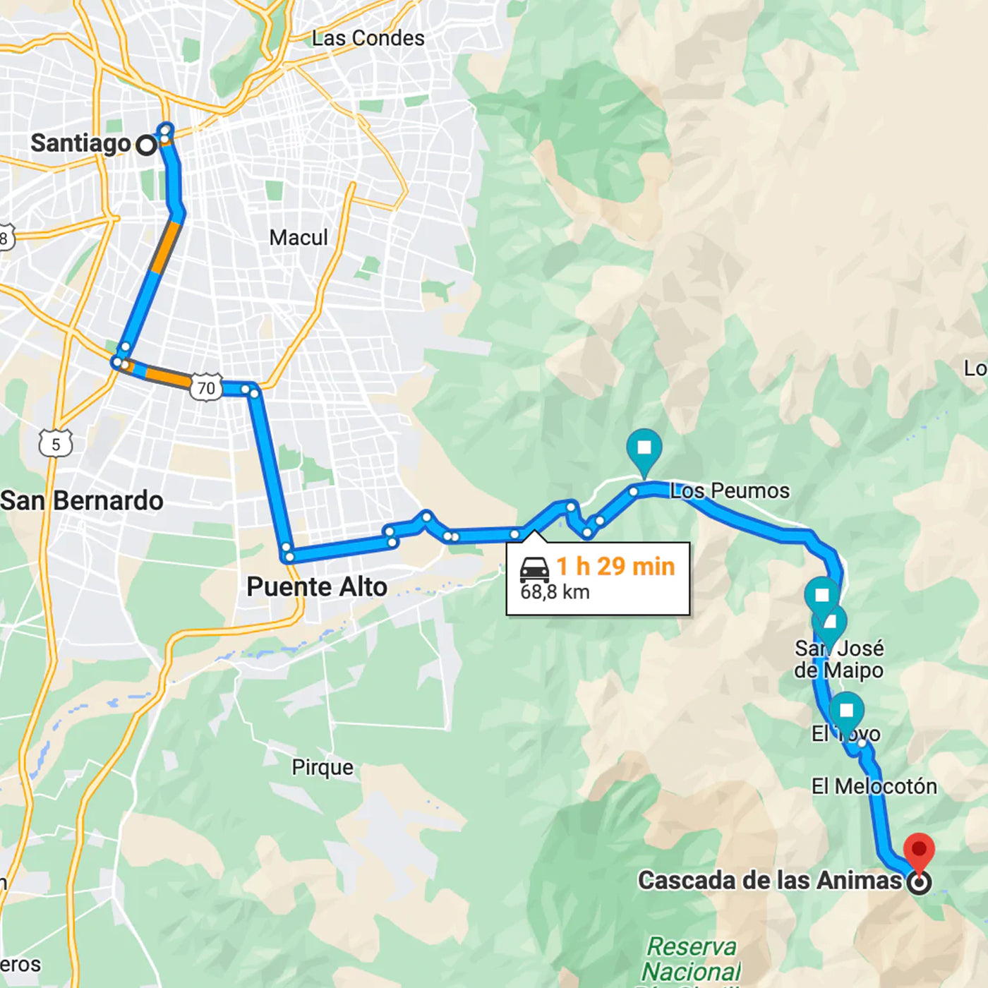 Auto: Se debe tomar la ruta G-25, también llamada Camino al Volcán, hasta la localidad de San Alfonso, cuando te estás aproximando veras carteles anunciando a unos cuantos metros la entrada de Cascada Las Animas, esta se encuentra a mano derecha de la ruta. Está muy bien señalizado.