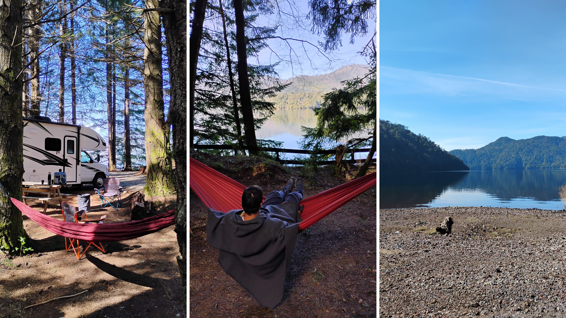 eso, llevaba mi equipo de Atakama Outdoor: sillas, termo, vasos y la infaltable hamaca. Colgué la hamaca entre dos árboles, preparé un mate y me dediqué a disfrutar de la vista del lago y la tranquilidad del bosque. Son esos momentos los que hacen que un viaje en motorhome sea tan especial.