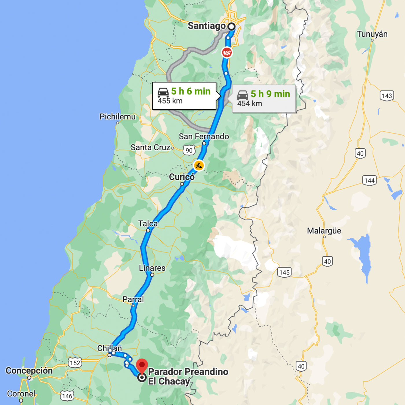 Auto: Saliendo desde Santiago son aproximadamente 6 horas hasta el Campin Parador Preandino El Chacay. Se debe tomar la Ruta 5 Sur, continuar por 5 horas hasta llegar a la salida de Chillán. Luego se debe tomar el camino hacia Coihueco en dirección a Pinto, al llegar a Pinto tomar la N55 y seguir por 1 hora aproximadamente hasta toparse con el camping, el cual se encuentra en el kilómetro 42,7, a mano izquierda de la carretera y esta señalizado con un cartel.