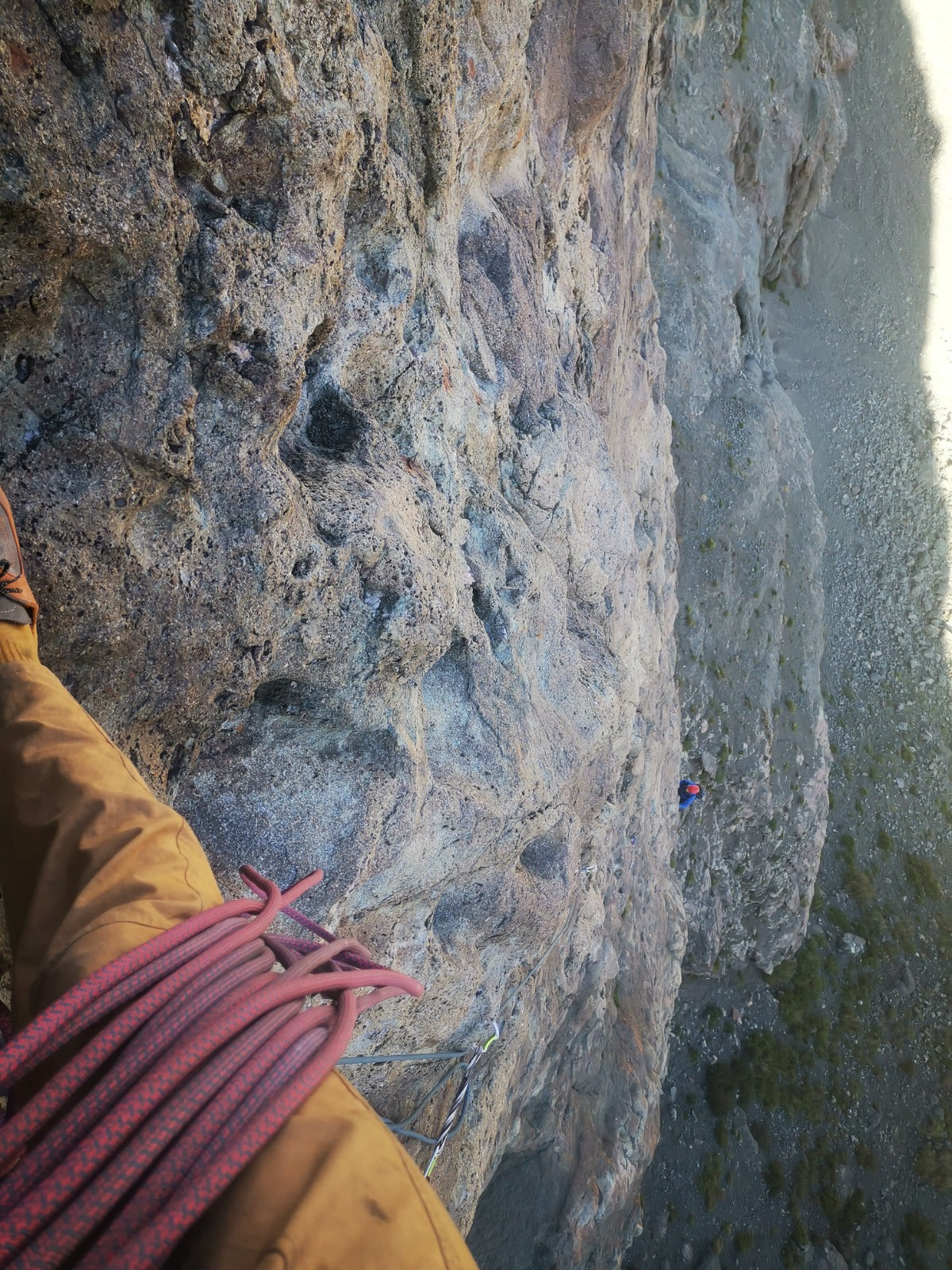 Si bien es un 10b de placa, luego de haber escalado 350+ metros, la altura y las horas escalando hacen mella en la resistencia, además, tu asegurador no te verá a lo largo de esos 40 metros de escalada, ni tu a él. El viento aumenta y la comunicación se dificulta, hay un par de chapas con pasitos bien pequeños entremedio, lo que da la sensación de un vuelo largo y adrenalínico.