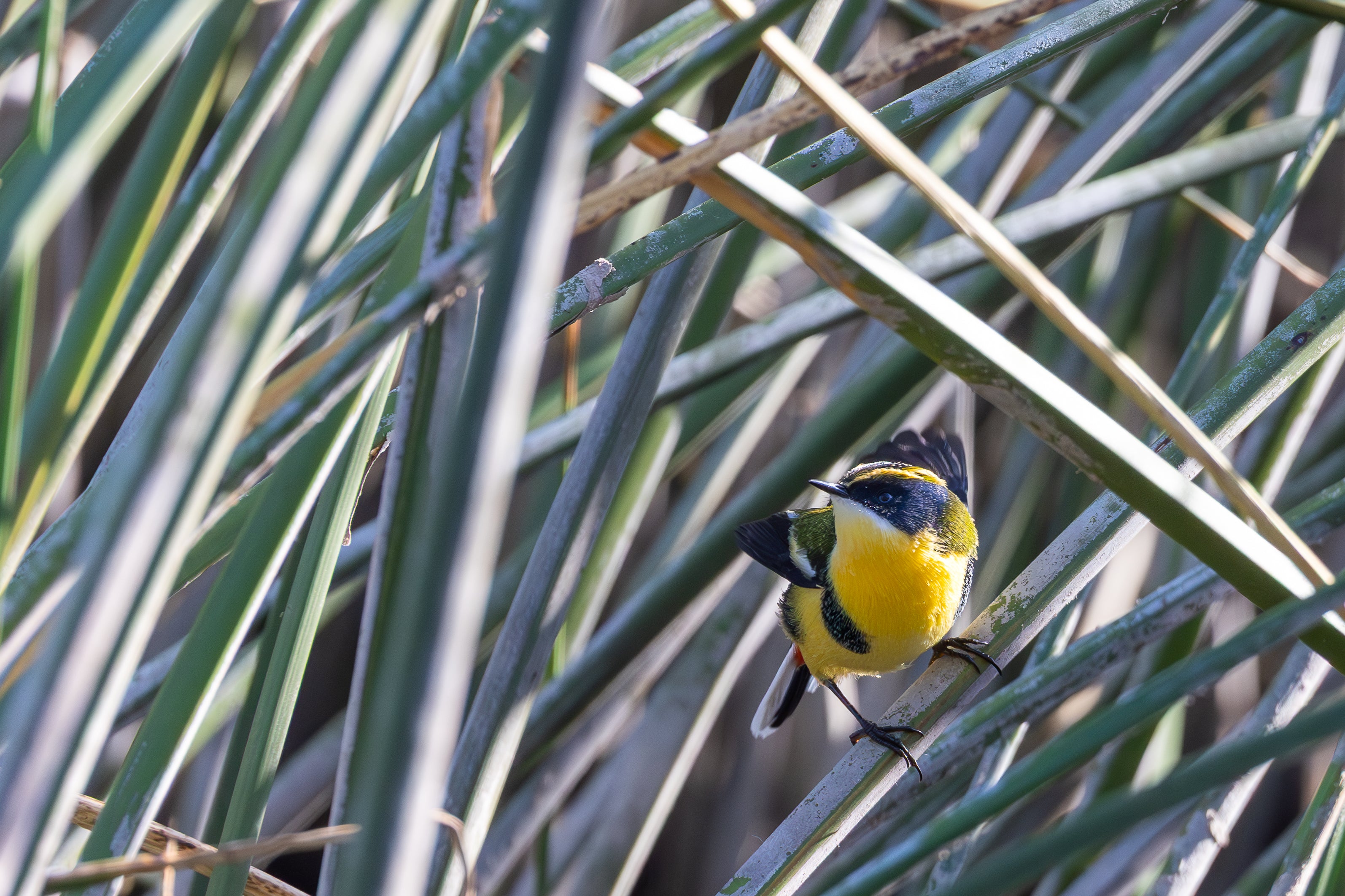 El primer desafío fue la espera. Esta ave es inquieta y territorial, pero también extremadamente sigilosa. Me instalé con mi cámara entre los matorrales, armado de paciencia y esperando algún indicio de su presencia. Después de casi una hora, un destello amarillo entre los juncos delató su movimiento. Pero ahí vino lo difícil: el siete colores no se queda quieto. Va y viene, da saltos rápidos entre las ramas y, cuando parece que lograste encuadrarlo, ya se esfumó.