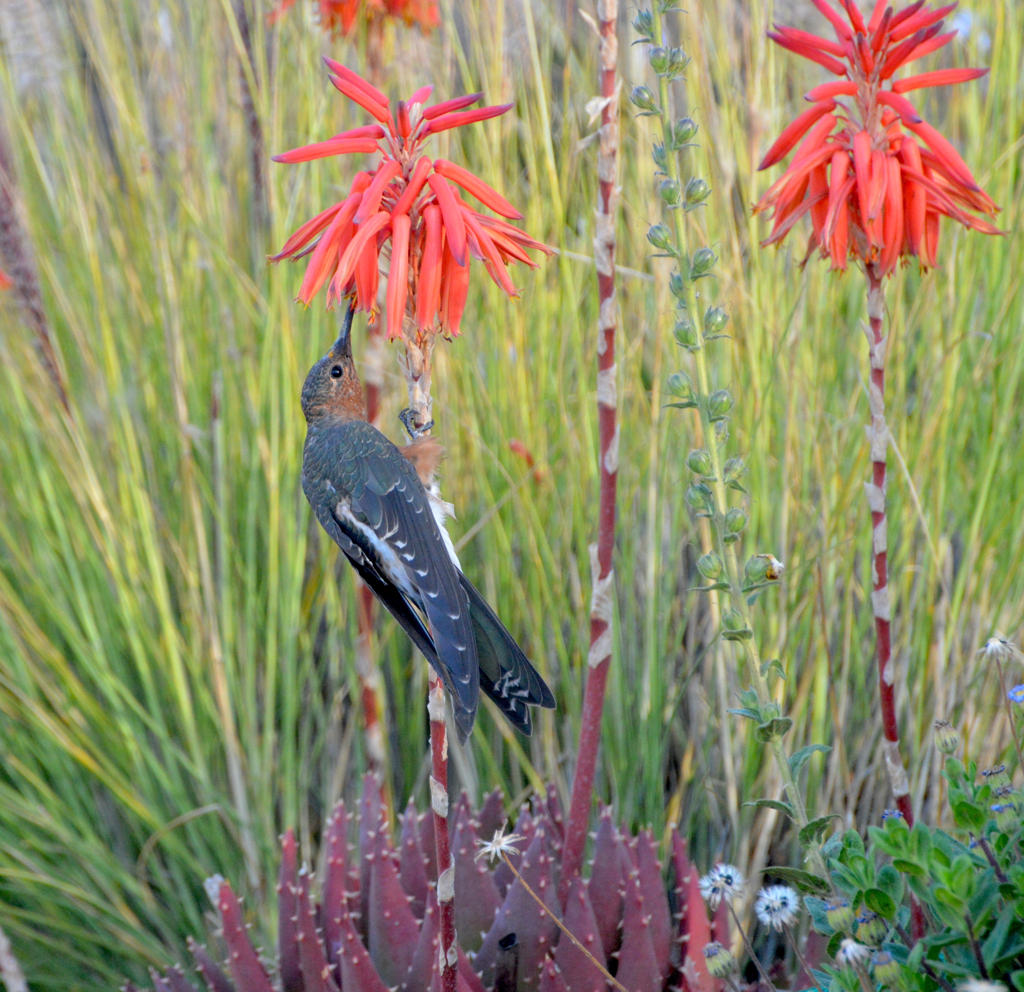 El picaflor gigante (Patagona gigas) aprovecha el néctar que le proporciona el Aloe o Sábila (Aloe perfoliata) que es una suculenta muy resistente y tolerante a climas calurosos, secos y que va formando colonias a ras de suelo. Sus flores son de un rojo intenso y aparecen en época de primavera y verano.