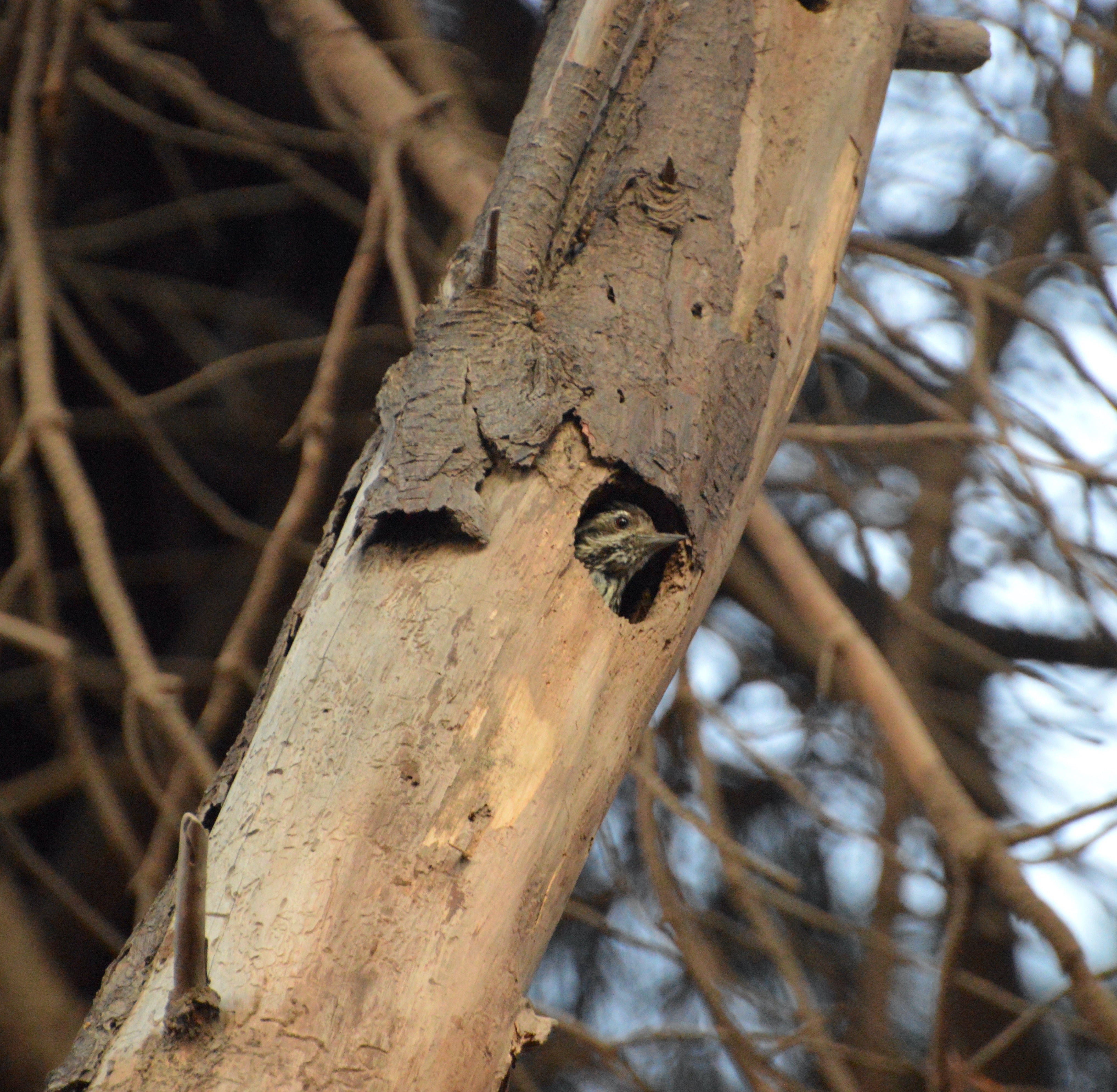 El carpinterito (Veniliornis lignarius), que no pasa desapercibido por su trino fuerte e intenso, busca insectos y larvas en la corteza de diversos árboles, como el pino insigne (Pinus radiata) originario de Estados Unidos y que se caracteriza por ser un árbol que puede alcanzar hasta 50 metros adaptándose muy bien a diversos tipos de suelos y climas.