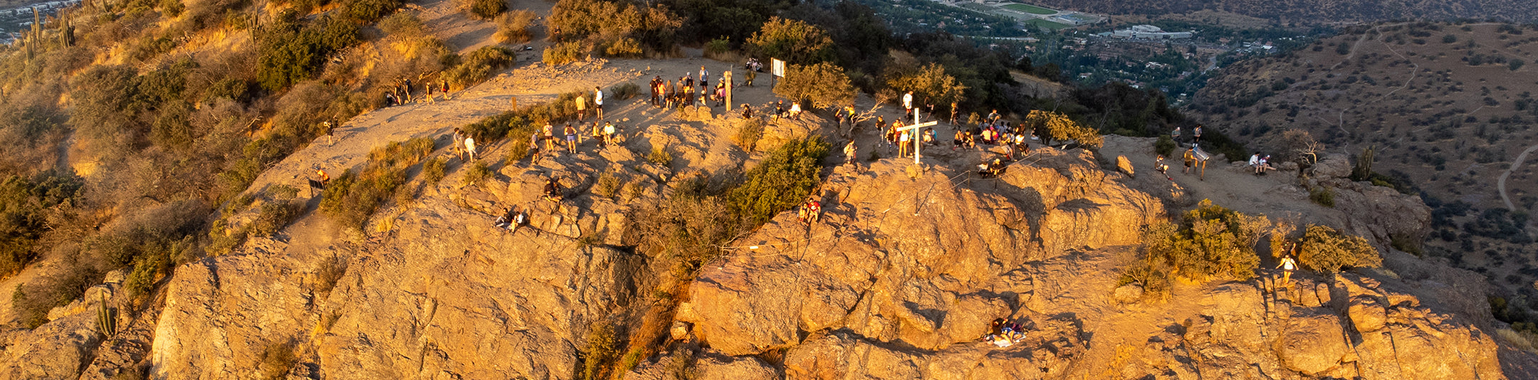 Obvio que también comimos algo para reponer energía, y antes de bajar nos sacamos fotos en la clásica cruz. Para nuestra suerte, en ese minuto justo se estaba escondiendo el sol y se veía precioso! Hermosa coincidencia. Luego de las fotos bajamos por el mismo sendero, conversando entre todos, y ya más relajados luego de haber cumplido casi por completo el desafío jajaja (digo “casi”, porque el trekking termina cuando uno llega seguro a su casa).