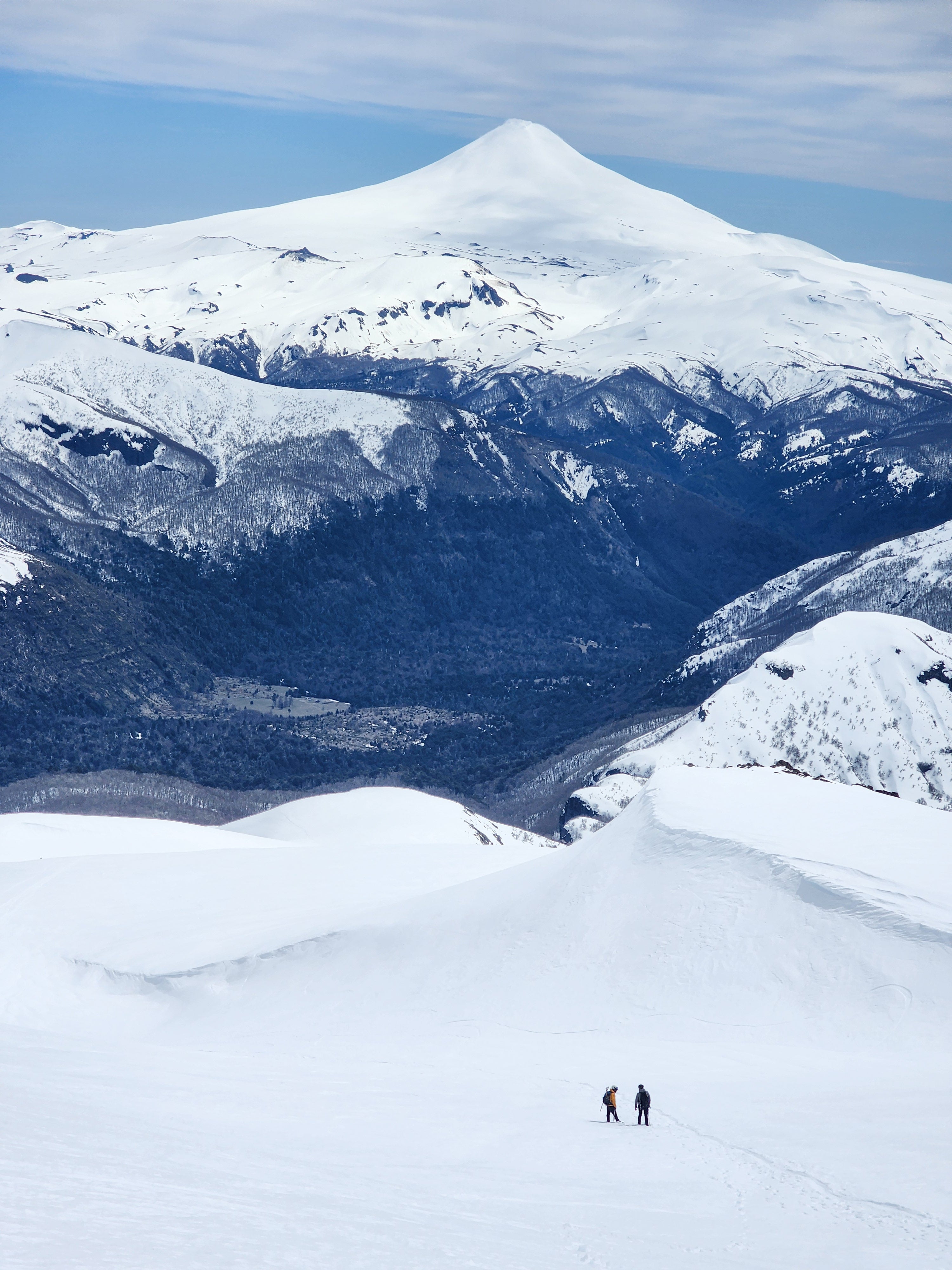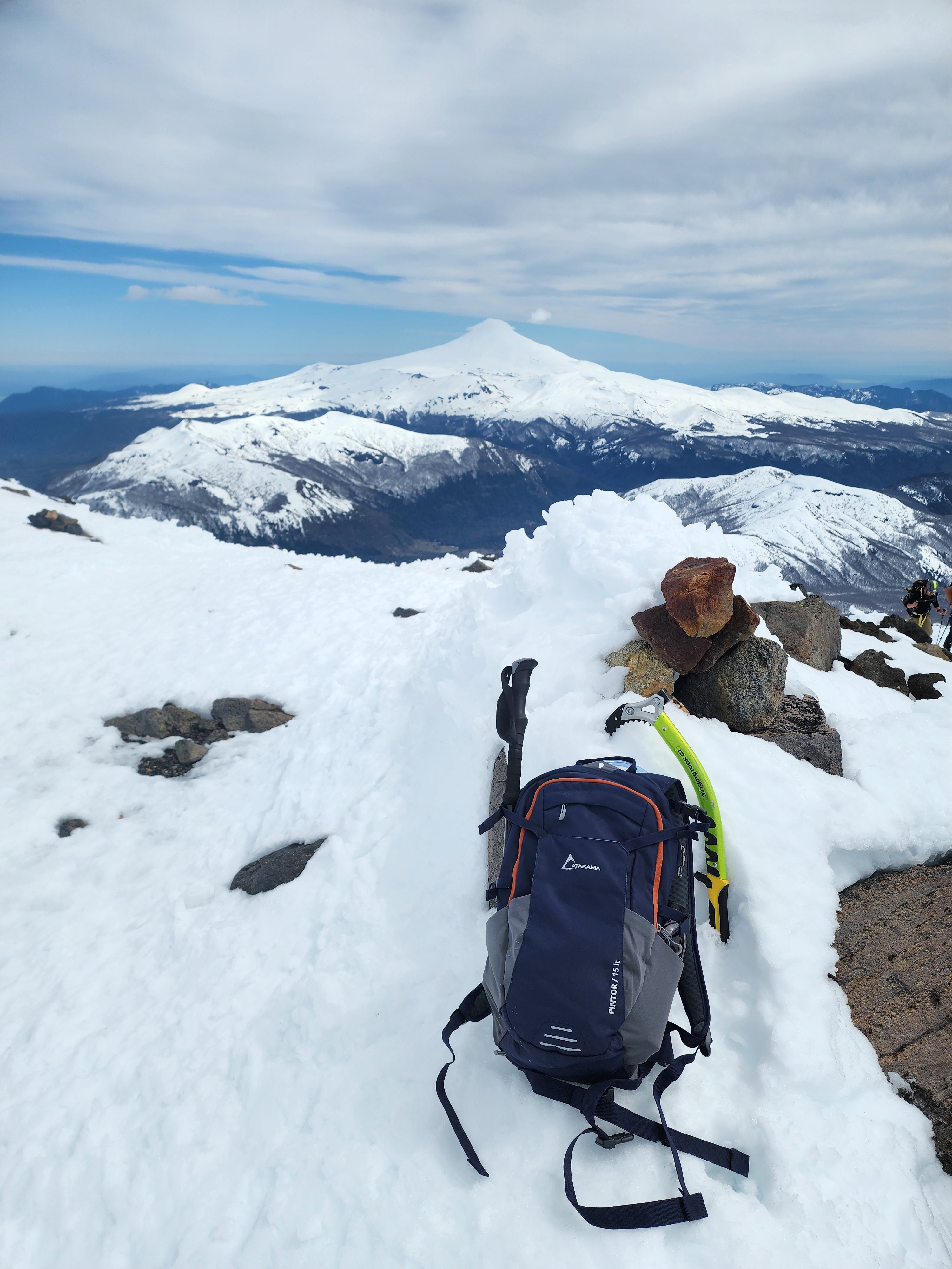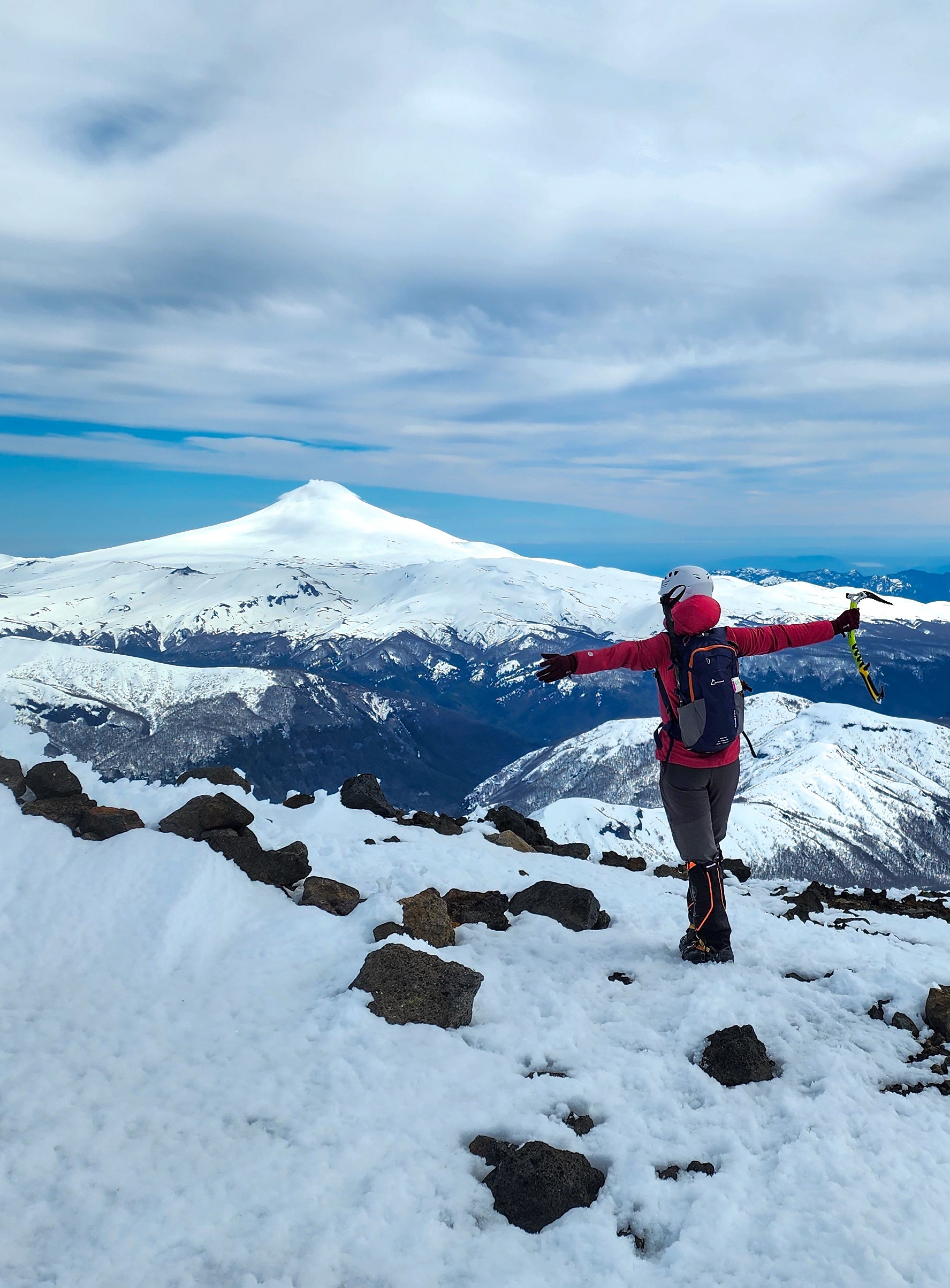 A mitad del recorrido, al salir del bosque, hicimos una pausa para reponer energías: comimos algo, nos hidratamos y preparamos el equipo: crampones, casco y piolet, listos para el tramo final. Con cada paso, el terreno se volvía más empinado y desafiante, pero a la vez, la cumbre se acercaba cada vez más. A eso de las 13:00 hrs hicimos cumbre, donde el viento soplaba con fuerza, pero a pesar de la intensidad, nos permitió disfrutar de una vista impresionante. Desde allí, contemplamos el vasto cráter del volcán, el imponente Volcán Villarrica a nuestra izquierda, el Lanín a lo lejos, y, en la distancia, el Mocho-Choshuenco, que se alzaba majestuoso en el horizonte.