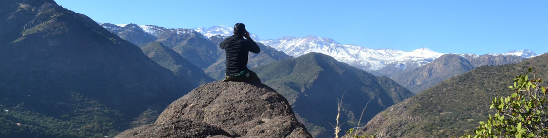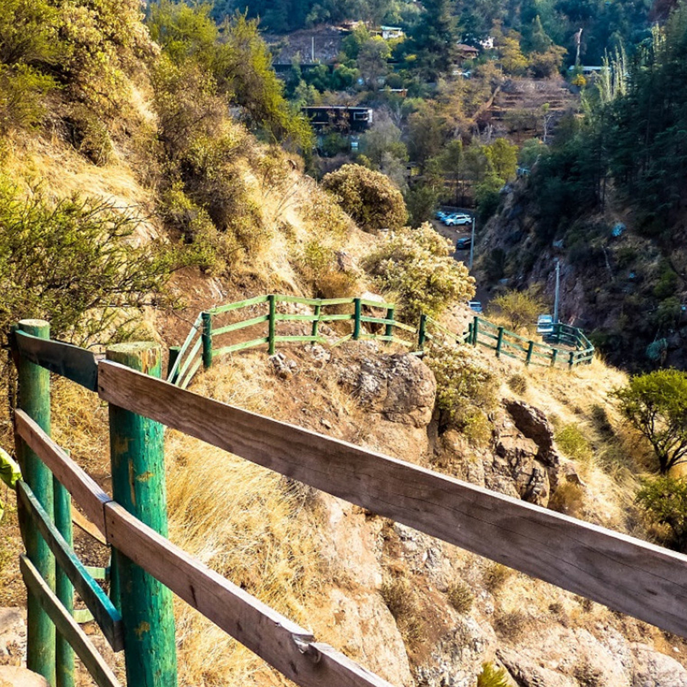 En el km 0,7 (1032m) se llega al portón que da acceso al Parque Cordillera, y a la administración respectiva. El registro es obligatorio, así como el pago. En este punto, se ingresa a una compleja red de senderos. Afortunadamente, está todo muy bien señalizado. Solo 45m metros después de este portal, nace una ruta hacia el sur, la que conduce al Salto del Apoquindo y al Alto las Vizcachas. No tomarla y continuar derecho hacia el Este por la vía principal (seguir indicación "Monolito"). En el km 1,0 (1057m) llega el sendero alternativo que baja del Morro Guayacán. No tomarlo (de todos modos, apenas se ve). Tan solo 220 metros más adelante se llega a un punto algo confuso: unos pocos metros antes de que el camino ancho muera se gira en casi 90° a la derecha (seguir cartel "Monolito") y se atraviesa un mini lecho seco. Inmediatamente después, se puede o bien tomar un breve atajo a la izquierda o bien seguir por el nuevo camino ancho y en 60 metros girar a la izquierda en otro camino ancho que nos permite recuperar el rumbo Este (de nuevo, en este punto seguir cartel "Monolito").