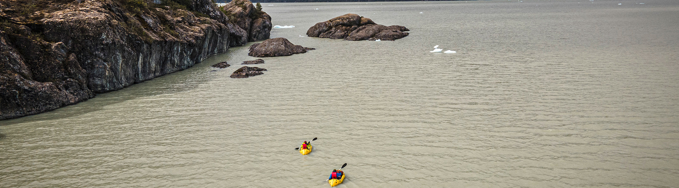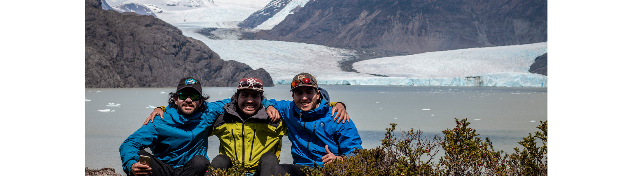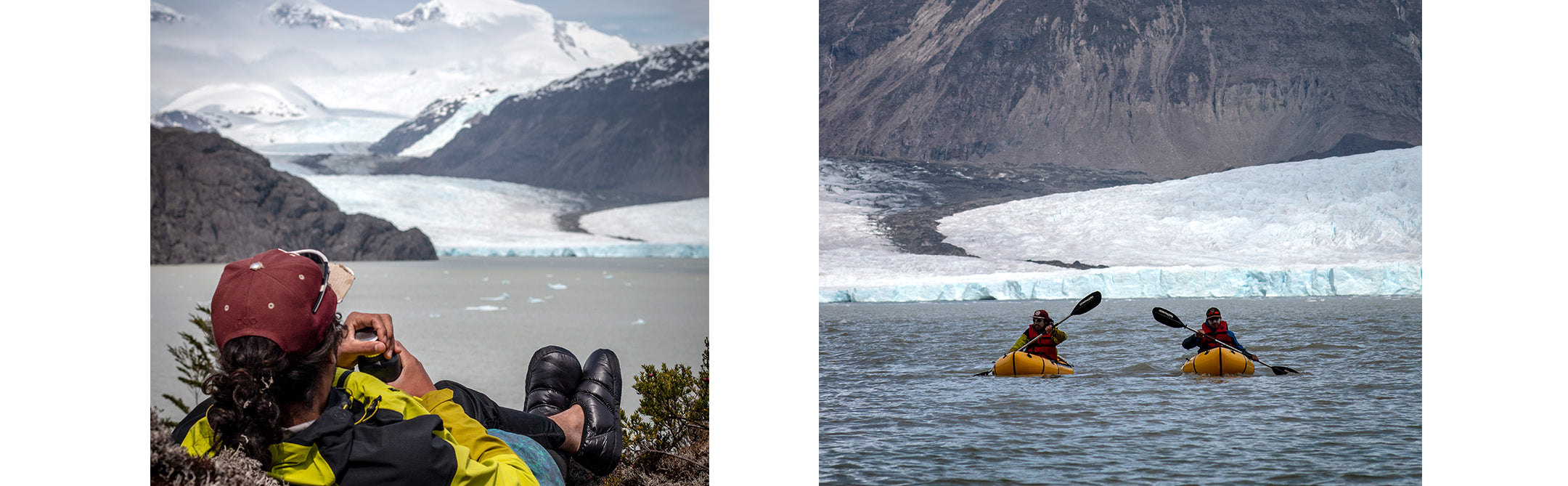 Día 8 partimos hacia el glaciar Lucía, el Lago estaba como una taza de leche muy calmo, remamos casi 1 km y ya estábamos navegando entre témpanos. Al tener solo 2 packraft para 3 por seguridad decidimos que yo (José) caminaría por el borde del Lago para ver una posible ruta de trecking y Nicolás y Ignacio navegaban al lado mío por si es que había alguna pasada en la que me debían asistir. En resumen fue una ruta de 6 km en donde pude progresar vía terrestre durante 5 km, al final de la ruta ya podíamos divisar casi en su totalidad el frente de la pared glaciar de casi 1,5 km o un poco más de ancho, el punto de observación estaba en una playa rocosa donde caía una cascada de 20 metros aproximadamente y habían unos pequeños cerros en donde se podía observar mejor el Glaciar, desde ahí nos instalamos y estuvimos explorando la zona y el glaciar con el Drone y registrando con nuestros celulares y la cámara de Ignacio todo lo posible para en una eventual vuelta al lugar hacer imágenes comparativas del rápido retroceso glaciar, podemos decir esto con mucha autoridad, ya que en la carta que habíamos comprado en el IGM aparecía que el glaciar Lucía tenía casi dos km más desde donde está actualmente, de hecho hace 6 años dividía al Lago Bergues en 2 partes. Luego de observar el glaciar por más de dos horas nos dispusimos a volver, esta vez nos fuimos todos remando y a la mitad de la ruta Nicolás se fue caminando por el borde del Lago, llegamos al campamento muy contentos y cansados, ordenamos las cosas para al día siguiente bajar por el río Borquez hasta el campamento base.
