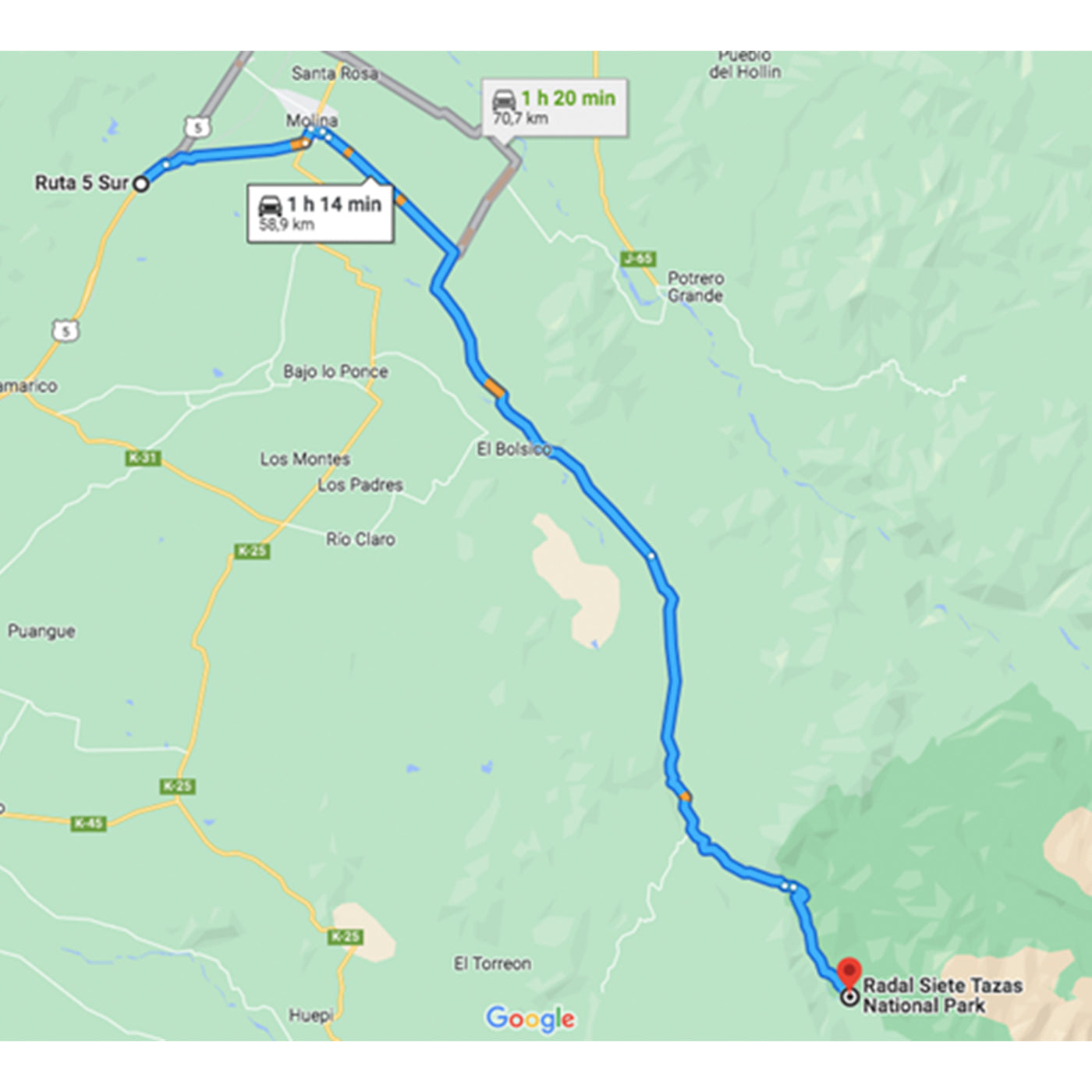 En auto: Tomar la ruta 5 sur hasta Molina y luego tomar ruta radal 7 tazas - parque inglés, ese trayecto tiene un total de 60 kms de los cuales los últimos 5 kms son de tierra.