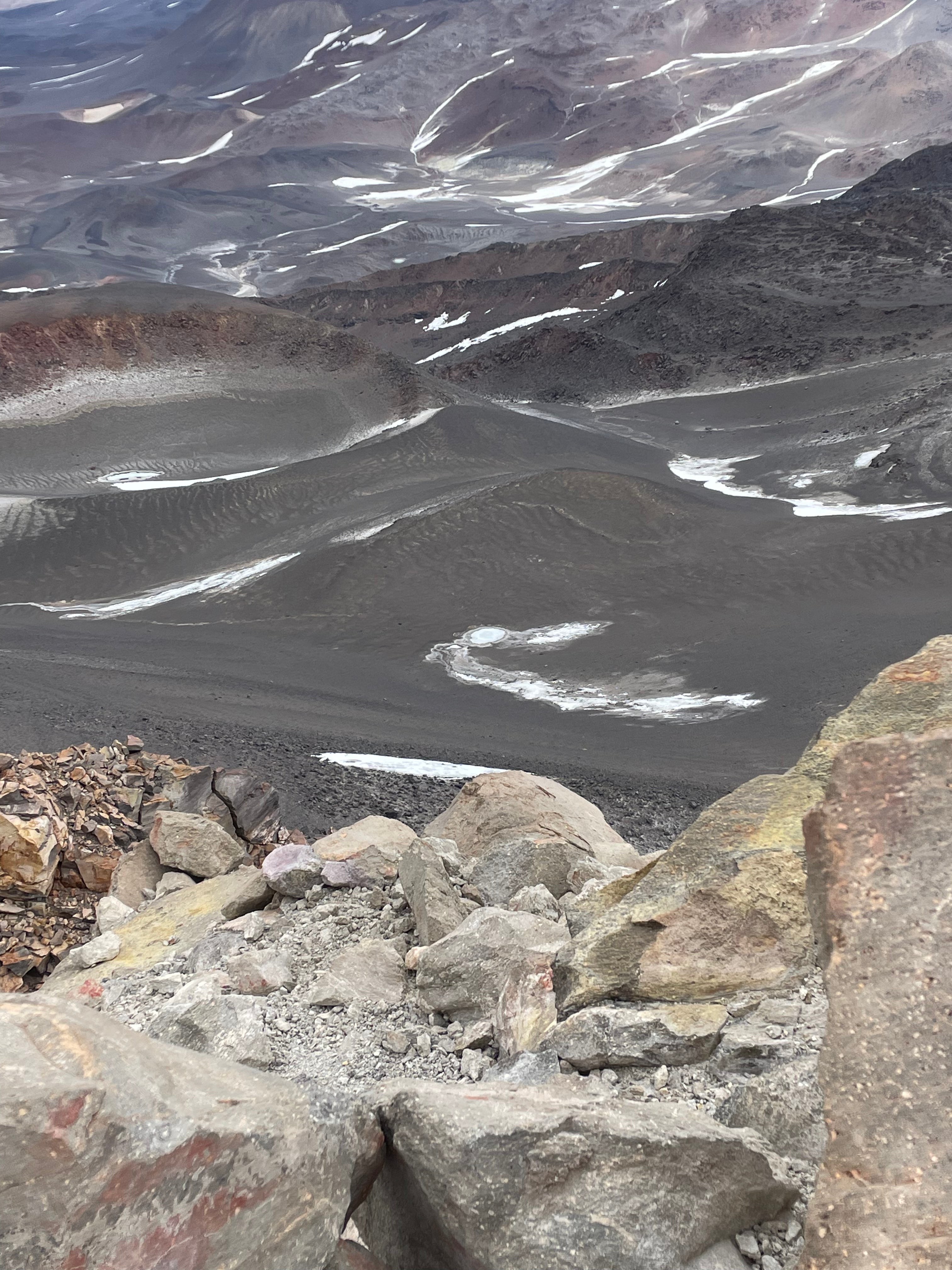 A las 5:30 a.m., comenzamos la caminata desde el Refugio Atacama, a 5,200 metros, luego de descansar media hora en el Refugio Tejos. A medida que avanzábamos, la montaña comenzó a nublarse, lo que nos generó dudas sobre si alcanzaríamos la cumbre, pero decidimos seguir adelante. Tras aproximadamente 9 horas de caminata, llegamos al cráter del volcán, donde nos esperaba la parte más desafiante: una escalada de 30 metros para alcanzar la cima.