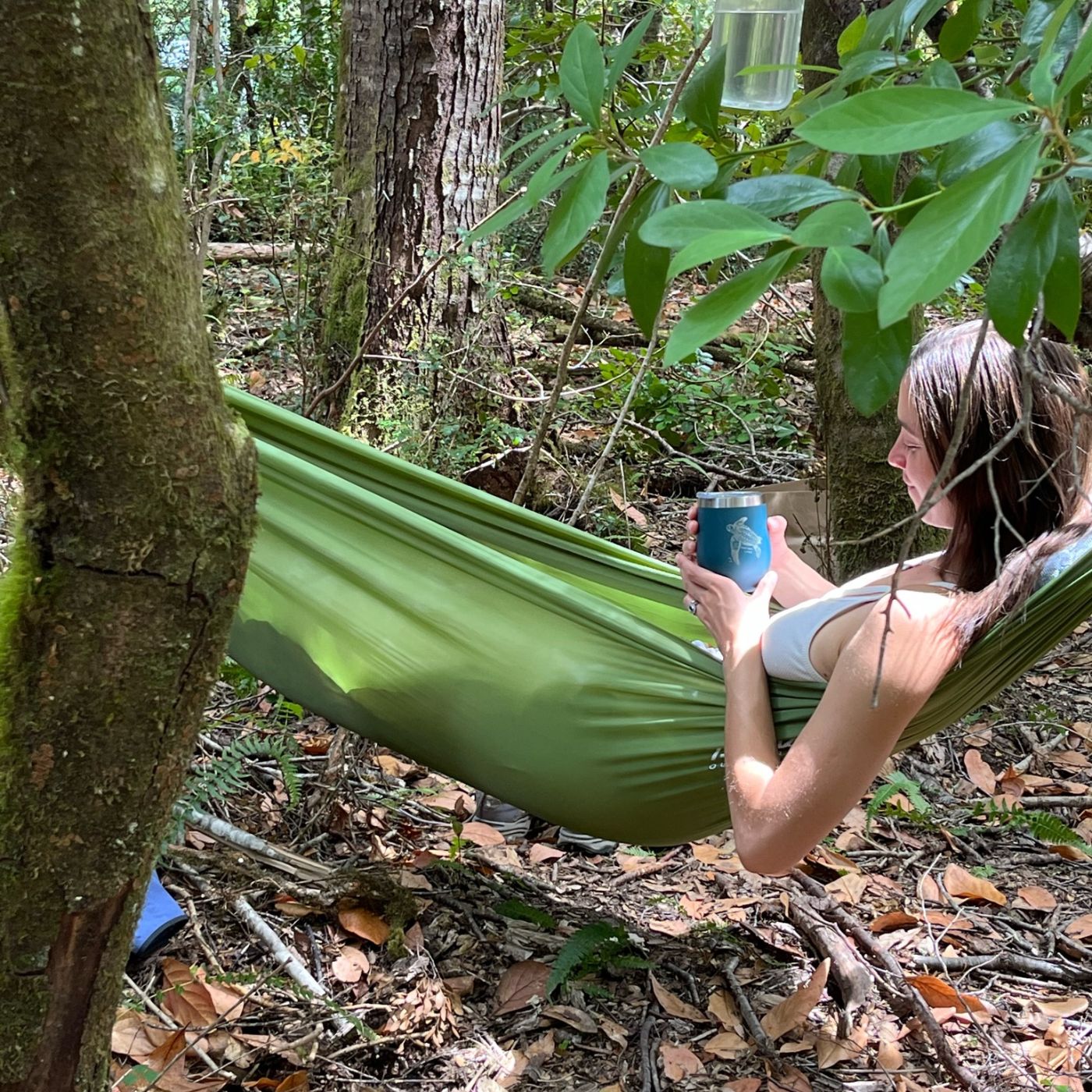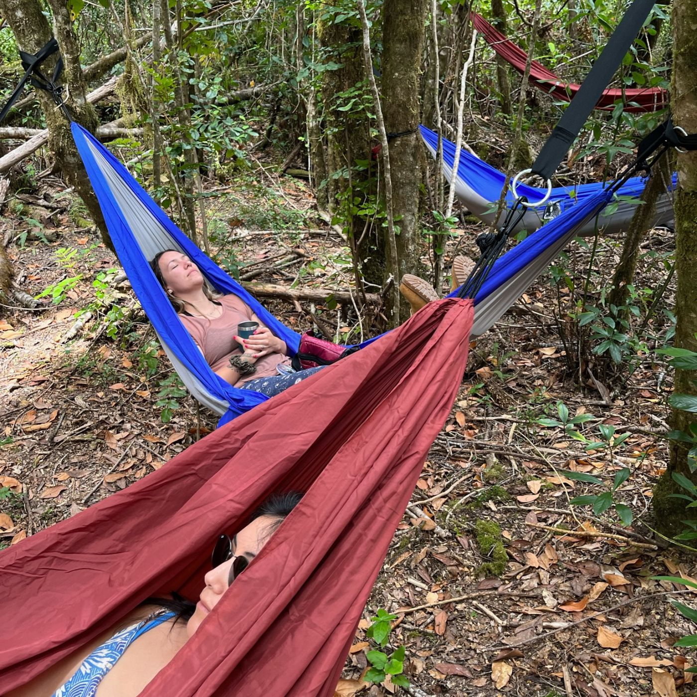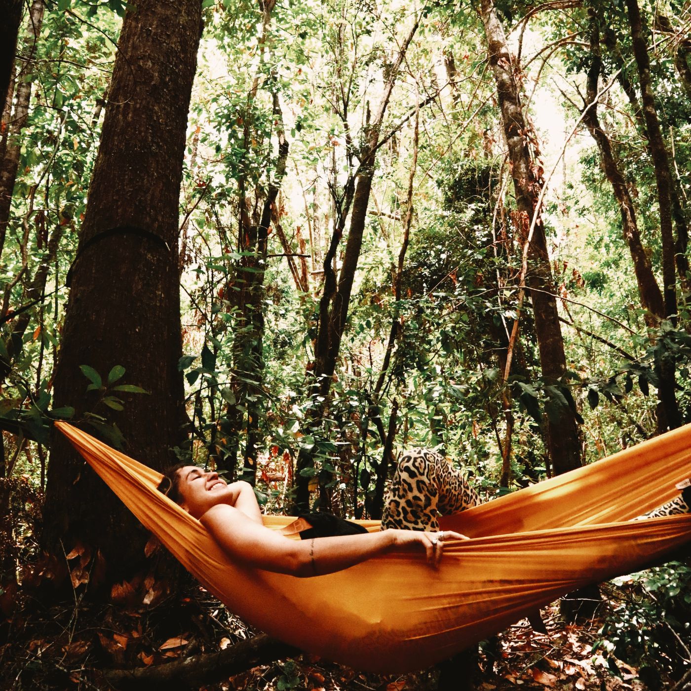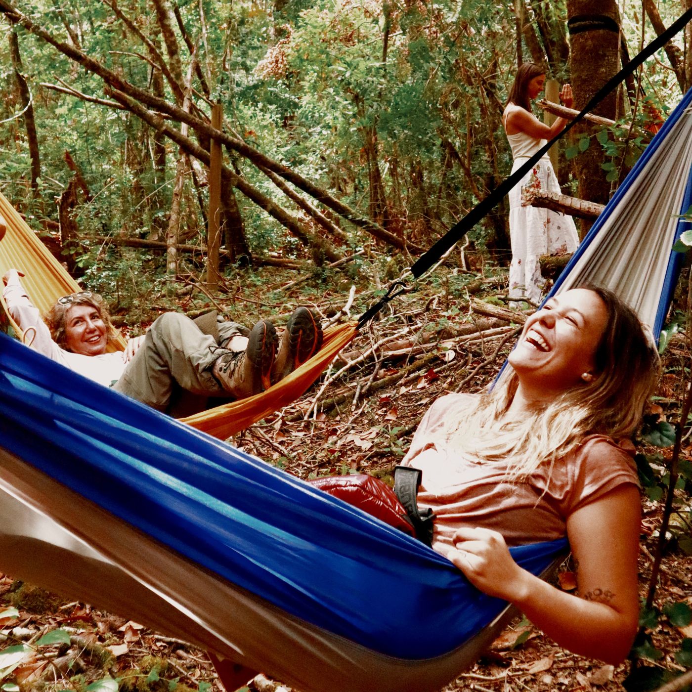 Todos los participantes colgando en hamacas, suspendidos bajo los árboles, sostenidos por el mismo. El fin de esta actividad era percibir a través de todos los sentidos los beneficios que esta escena tenía para nosotros