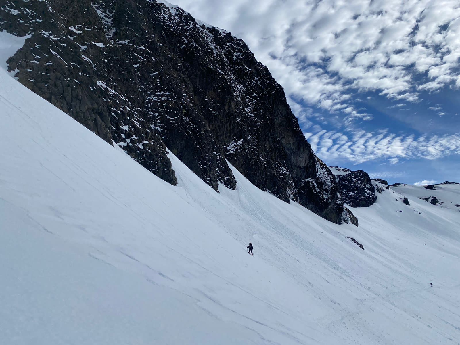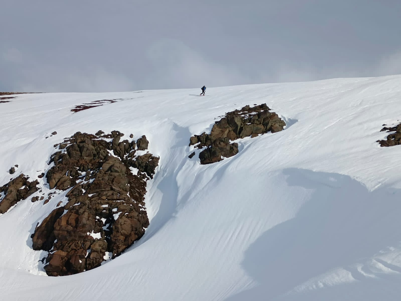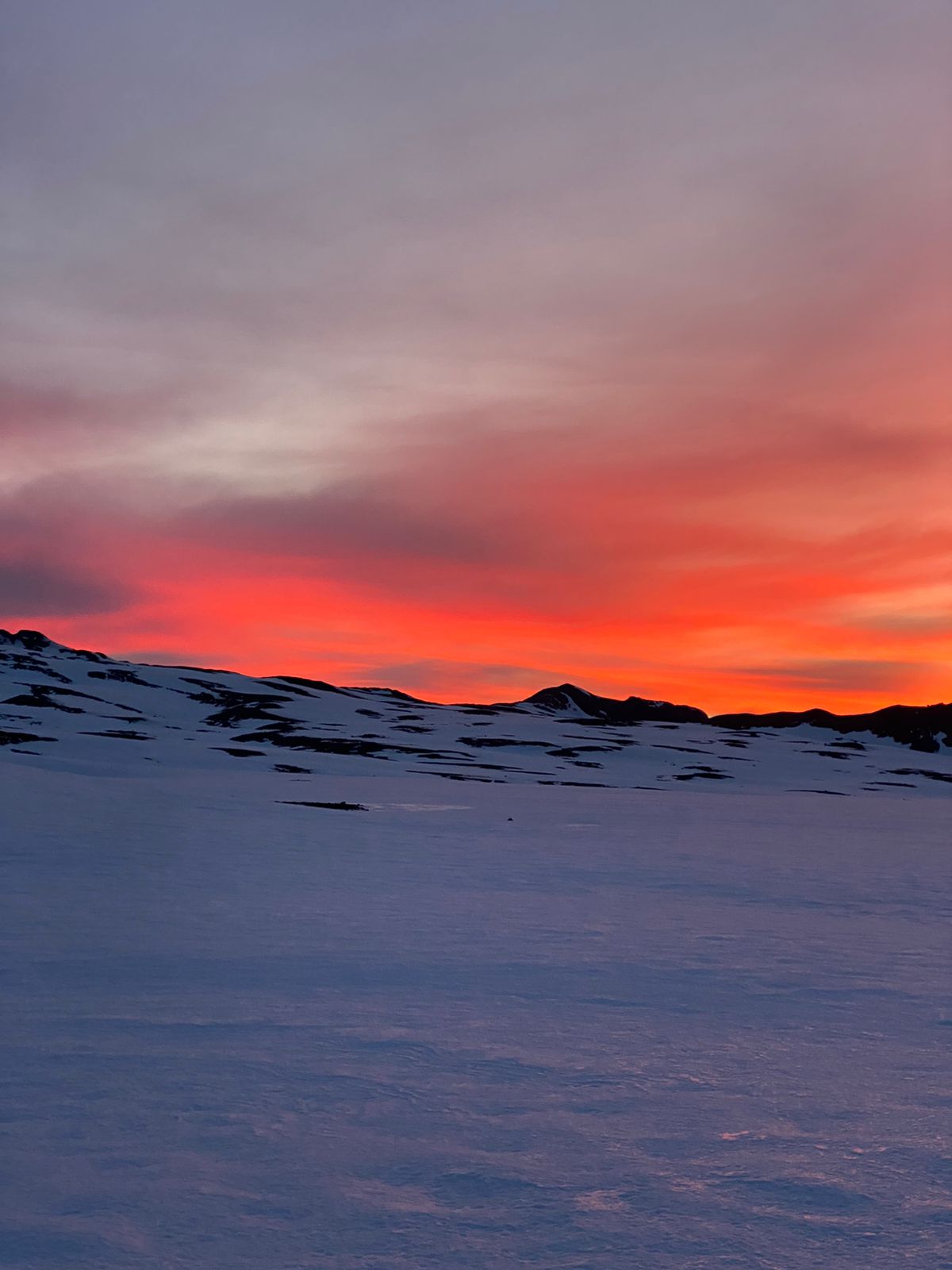 Llegamos en los últimos minutos de claridad y con este hermoso atardecer. Debido al viento, tuvimos que hacer cuevas en la nieve para armar las carpas con algún respaldo del viento, lo que nos agregó una hora más de trabajo de pala. Este día dormí agotada, pero valió la pena el trabajo pq la carpa quedó bien protegida en la nieve.