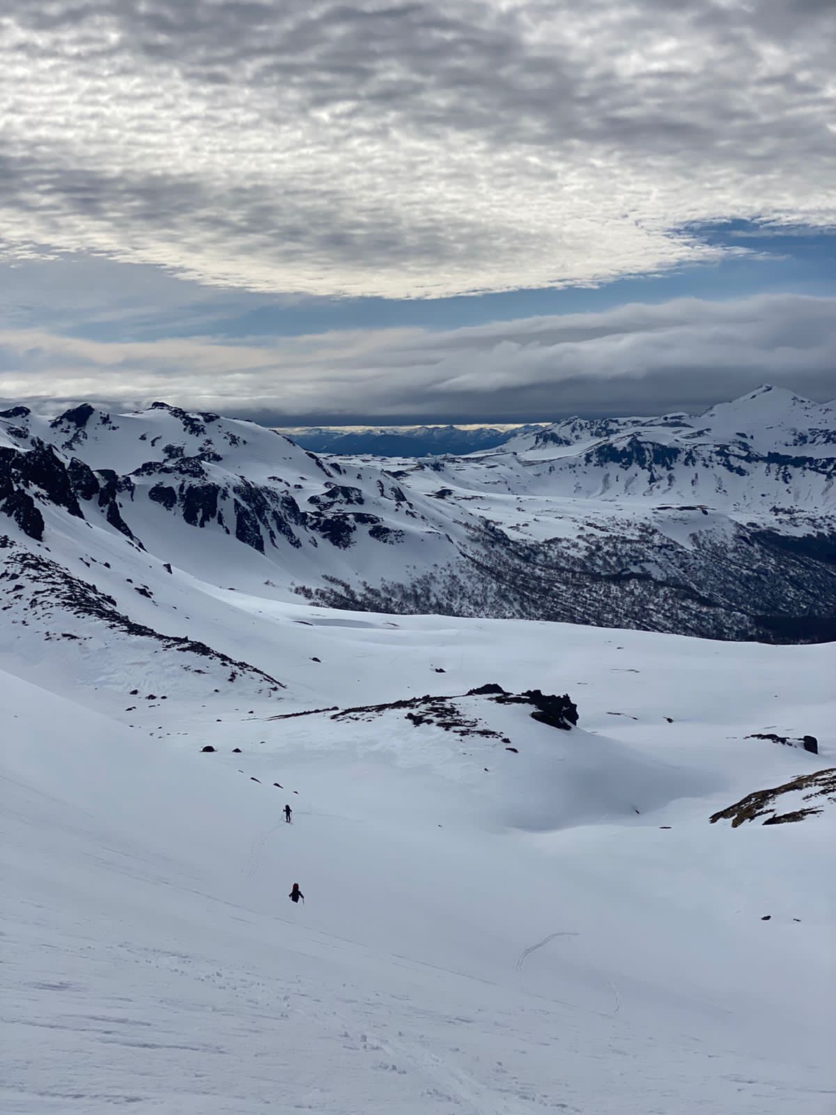 Día 2 - Nos levantamos a las 6, aun estaba oscuro. El plan era desarmar el campamento y empezar a caminar después del amanecer. Caminamos 10 horas en el día con mayor desnivel, 838 metros y un total de 16 km. Había un salto de agua congelado, quecse veía precioso. Acampamos en un sector más alto, ya bastante lejos de las zonas con vegetación. Era un lugar asustadoramente bello: teníamos al Lanin enfrente a nosotros, vestido de naranjo y con una nube lenticular de sombrero. Al otro día, el Lanin amaneció enrollado en una nube, como si fuera su mantita.