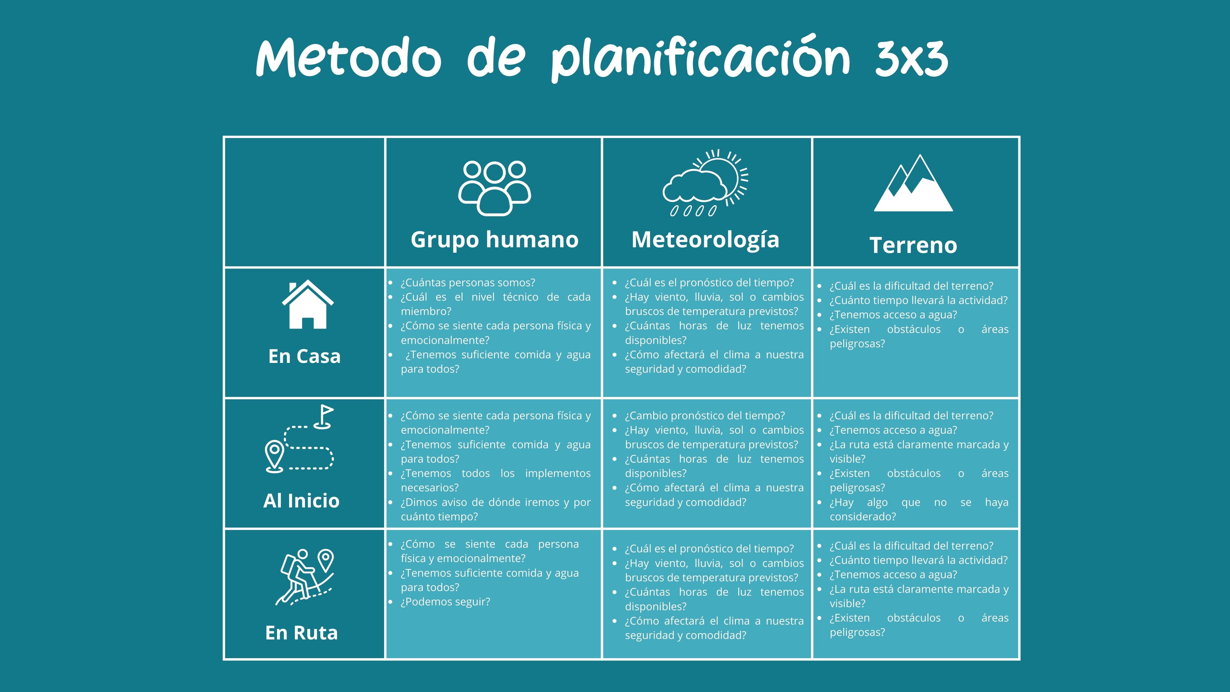 Aquí está la clave para utilizar el Método 3x3: en cada uno de los momentos (antes de la actividad, durante la actividad y en puntos críticos), te haces preguntas específicas relacionadas con tres factores principales: el grupo, las condiciones y el terreno. Estas preguntas te ayudan a evaluar el riesgo y a tomar decisiones conscientes sobre si debes seguir adelante con tu plan o ajustarlo para garantizar la seguridad.