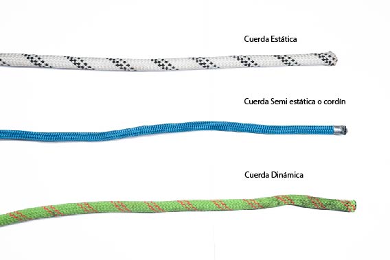Las cuerdas estáticas son ideales para izar cargas y trabajos verticales debido a su baja elasticidad (1.5% a 3%). Las semiestáticas, conocidas como cordines, tienen una elasticidad de 3% a 5% y se utilizan en elementos de seguridad, como nudos autobloqueantes. Las cuerdas dinámicas son usadas en montañismo y escalada para asegurar a personas en caso de caídas, con una elongación del 5% al 10%.