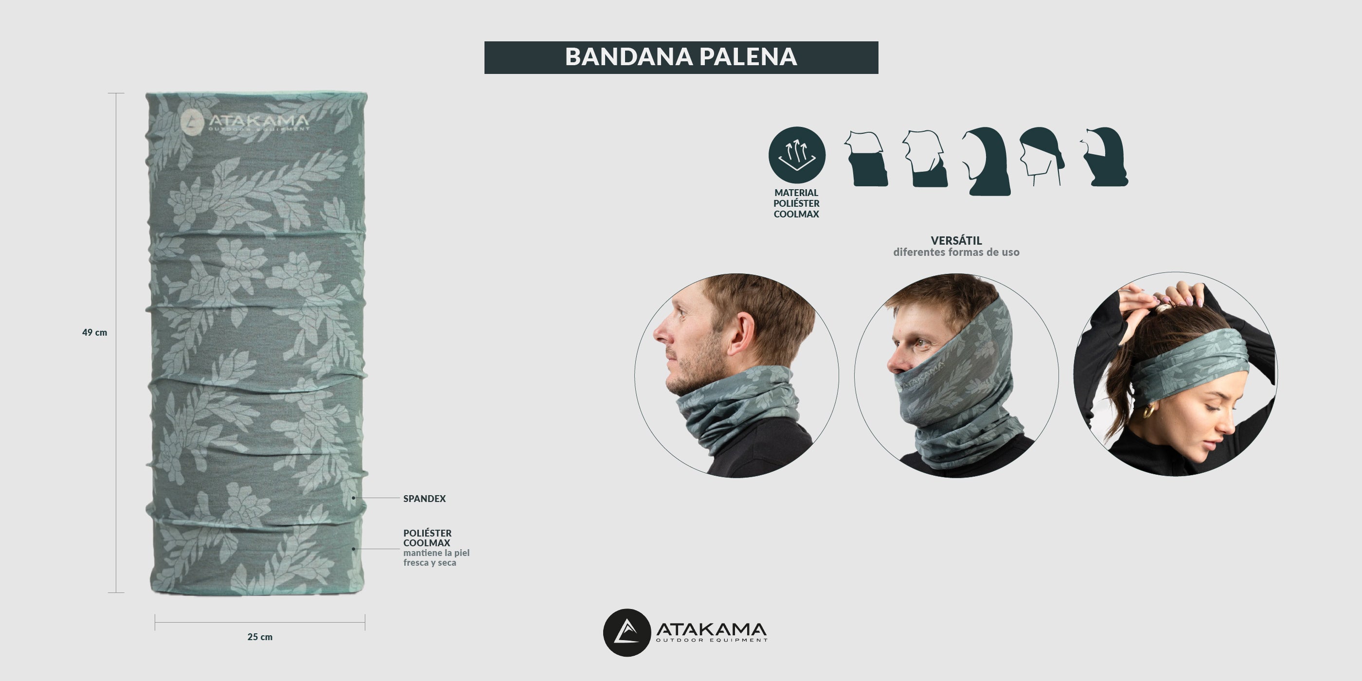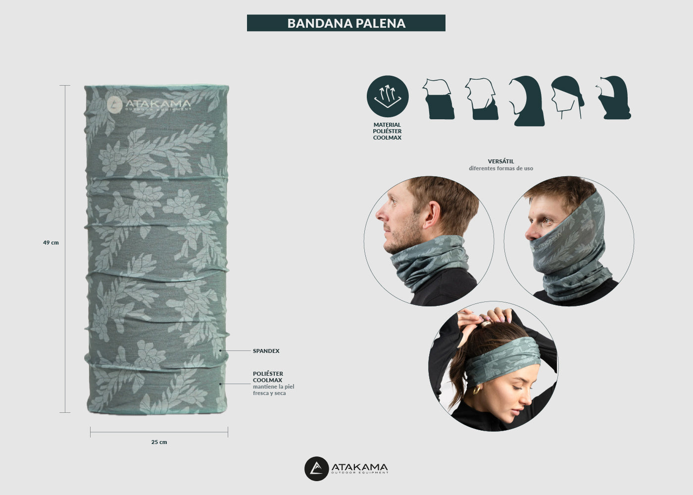 Bandana o Buff multifuncional para actividades al aire libre con diseño inspirado en colores y texturas de Chile, ilustradas por artistas chilenas.