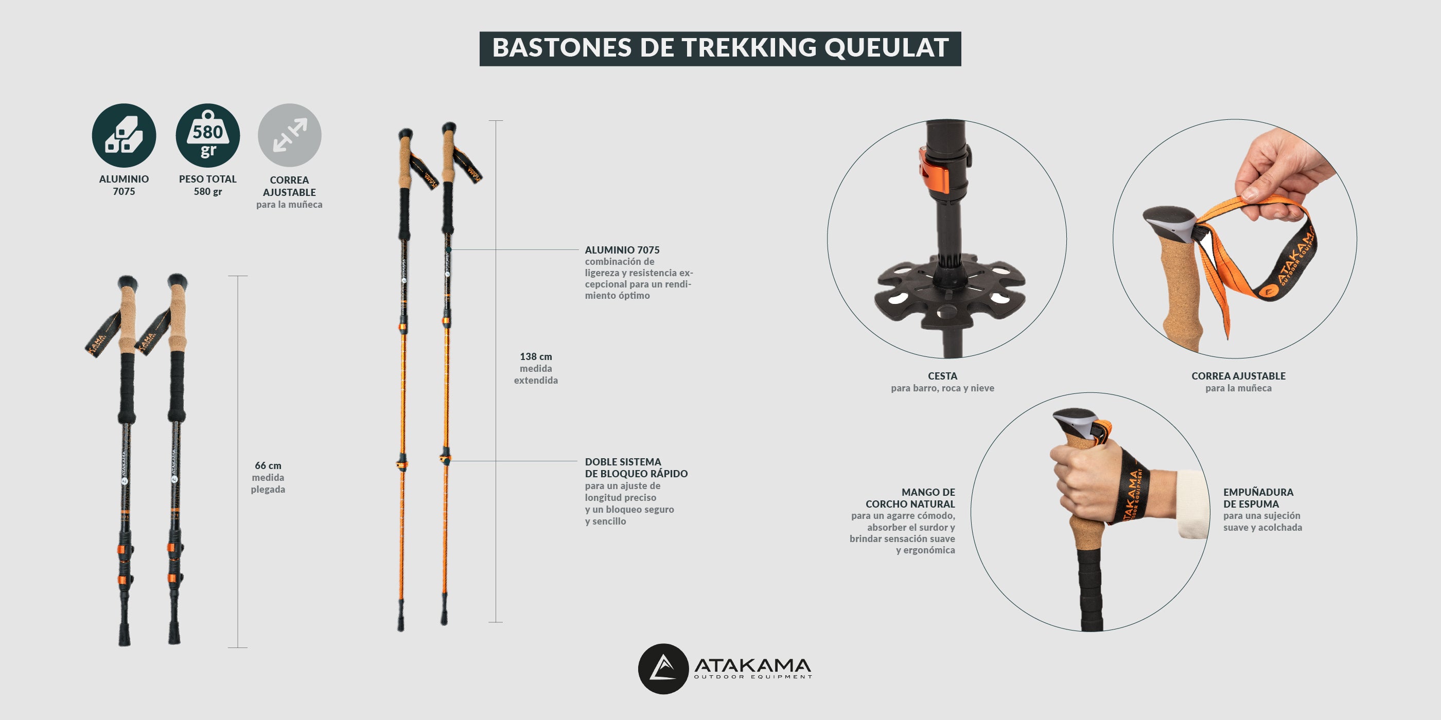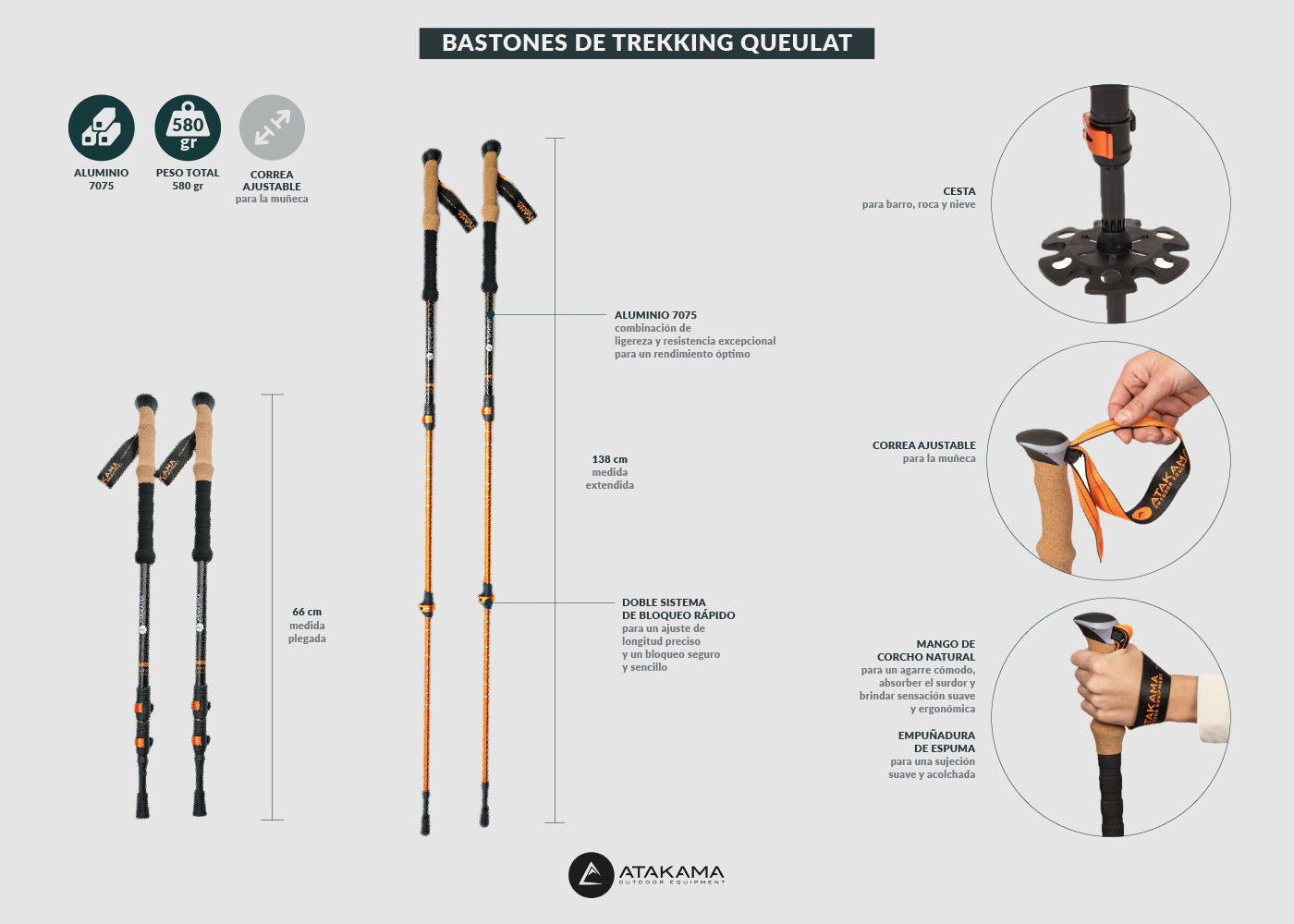 Bastones de Trekking Queulat, distribuyen el peso del cuerpo para reducir la carga en piernas y articulaciones. Hechos de aluminio 7075, cuentan con mango de corcho, empuñadura de espuma y bloqueo rápido, ideales para terrenos exigentes.