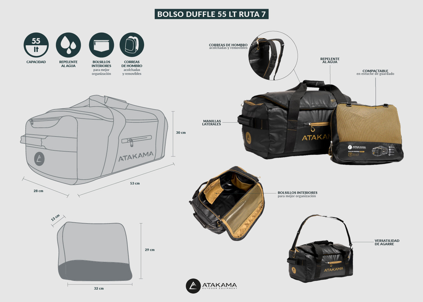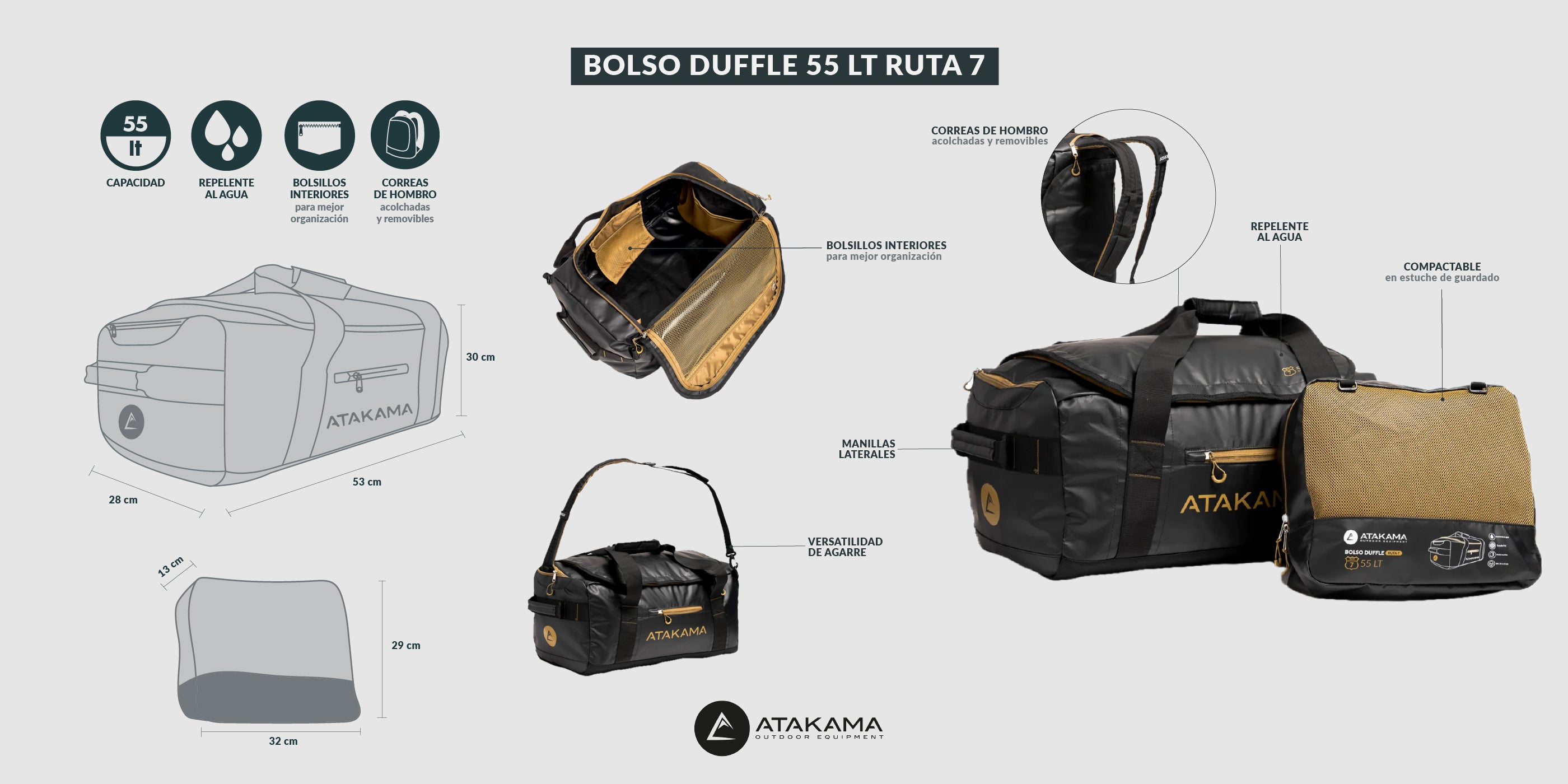 Bolso Duffle 55L resistente al agua, cómodo y compactable, con correas acolchadas y estuche multifuncional.