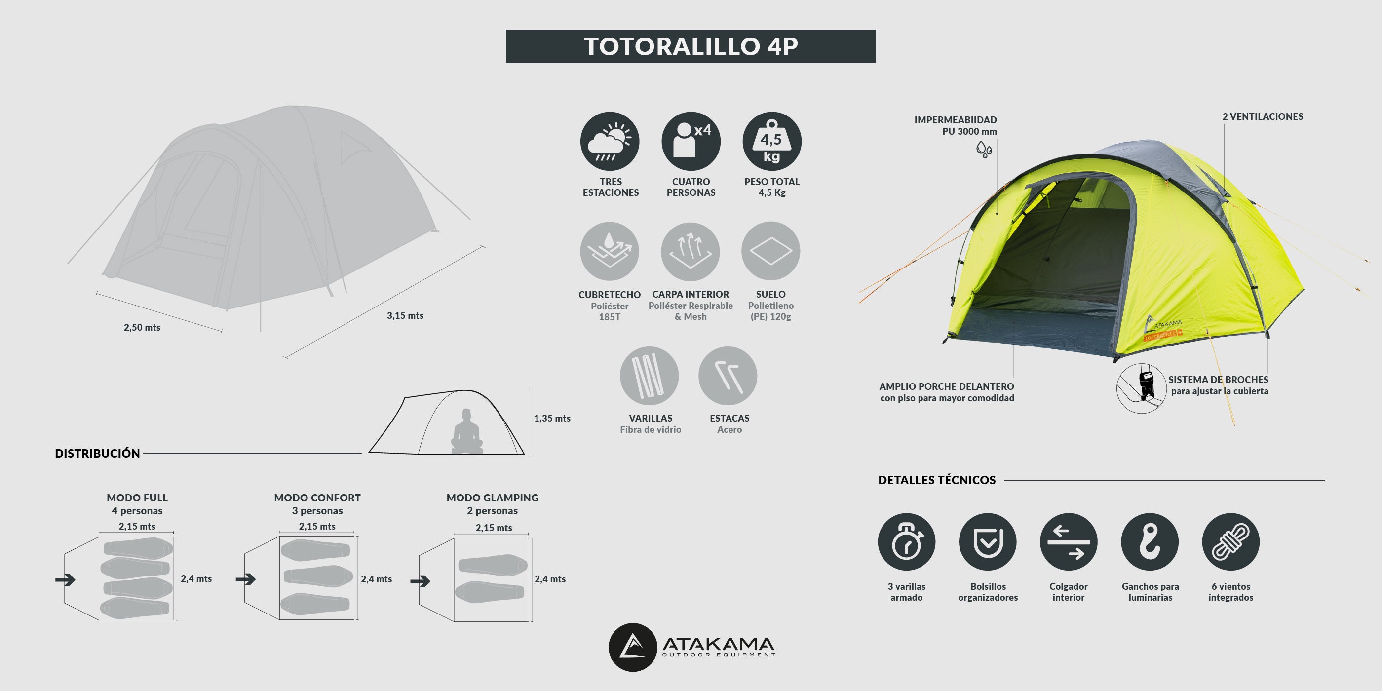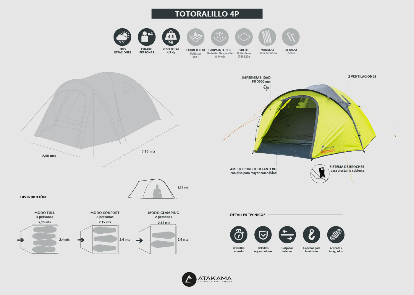 Ideal para quienes buscan una carpa espaciosa, resistente y bien equipada para disfrutar de la naturaleza. ¡Convierte cada campamento en una experiencia inolvidable!