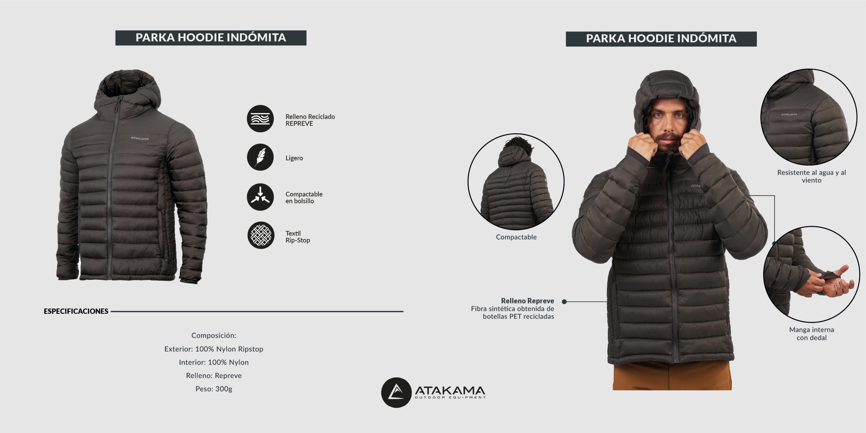 Equípate y abrígate con nuestra parka térmica Indómita, con capucha ajustable y cuello alto. Se guarda en el bolsillo interno.