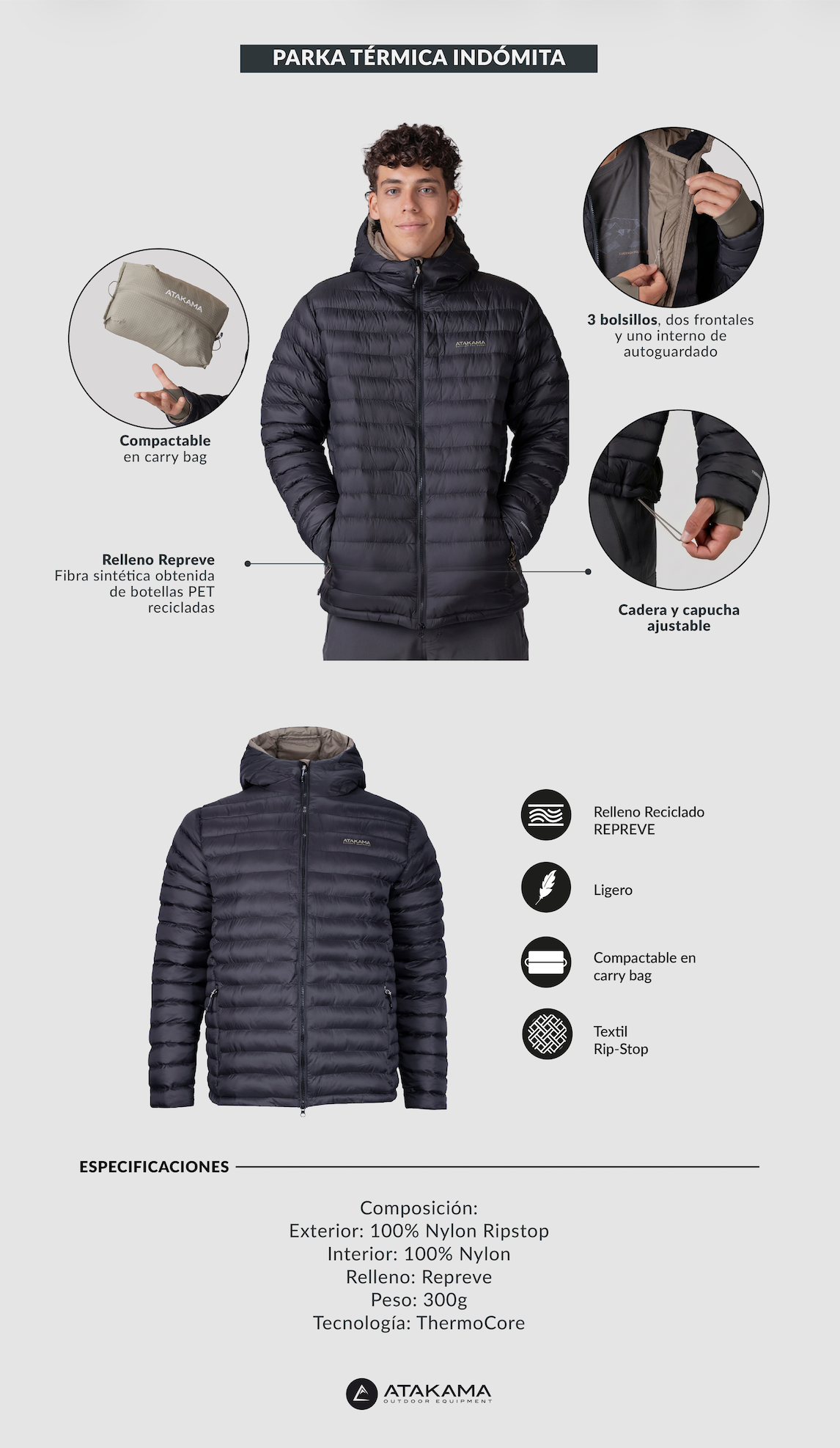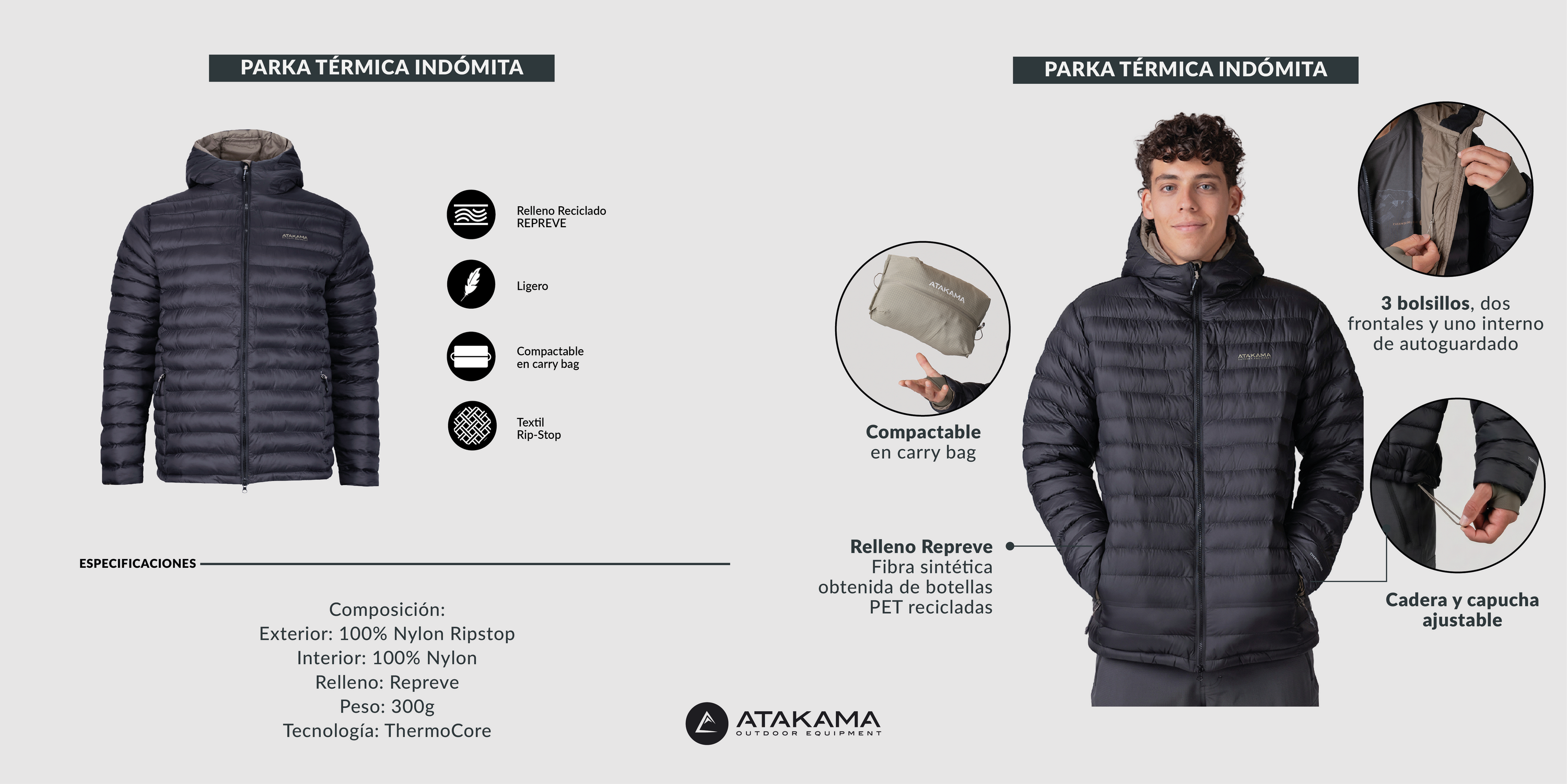 Equípate y abrígate con nuestra parka térmica Indómita, con capucha ajustable y cuello alto.
