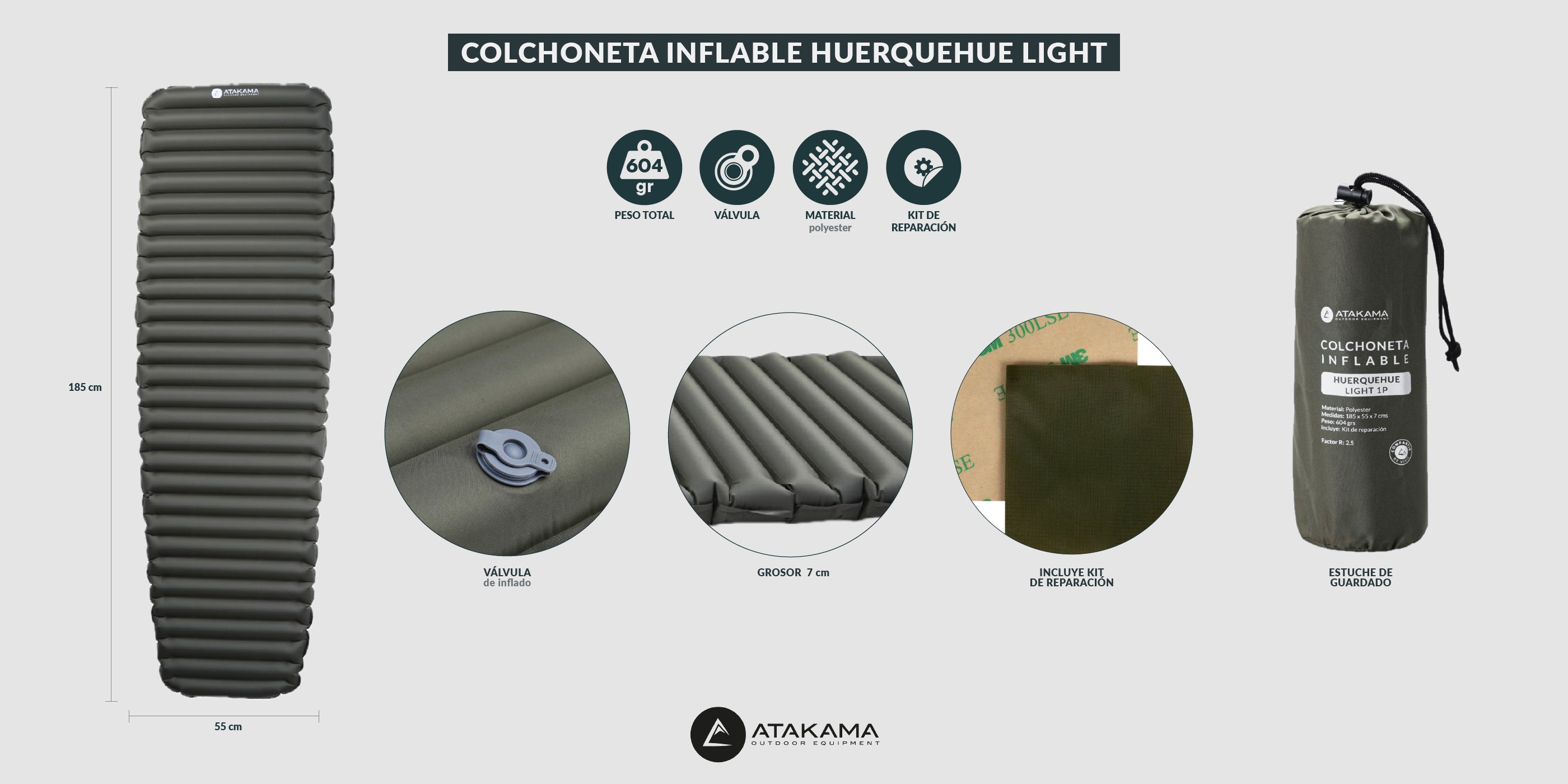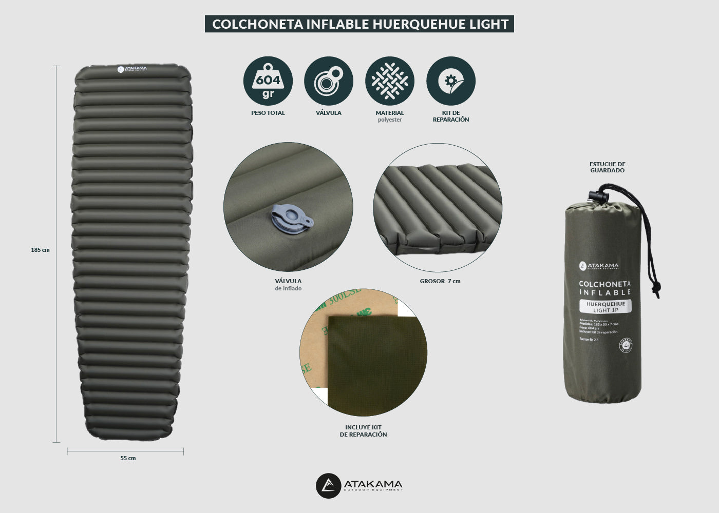 Una de las principales ventajas de esta colchoneta es su capacidad de compactarse y su peso, un indispensable para tu trekking o camping. Incluye un kit de reparación.