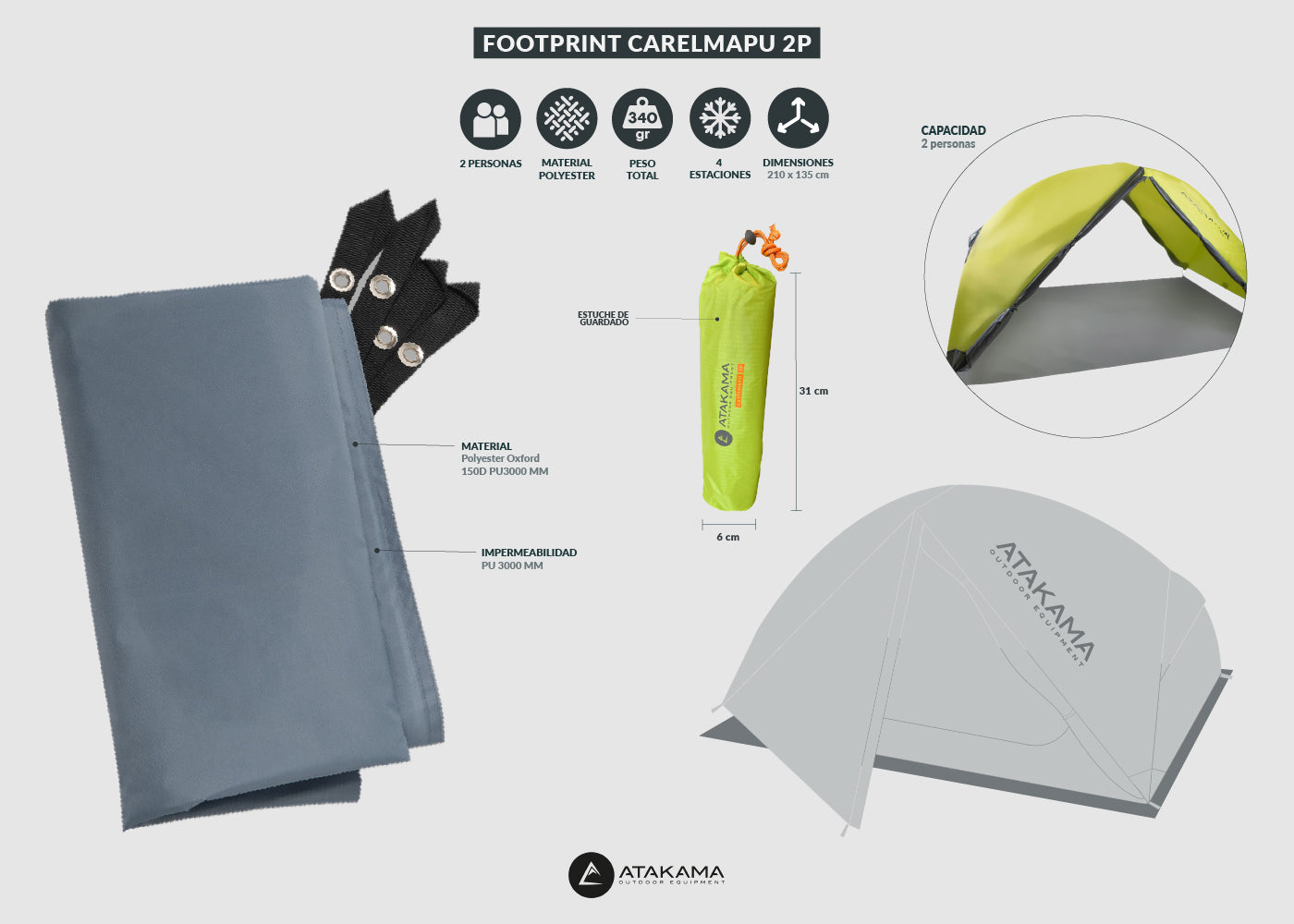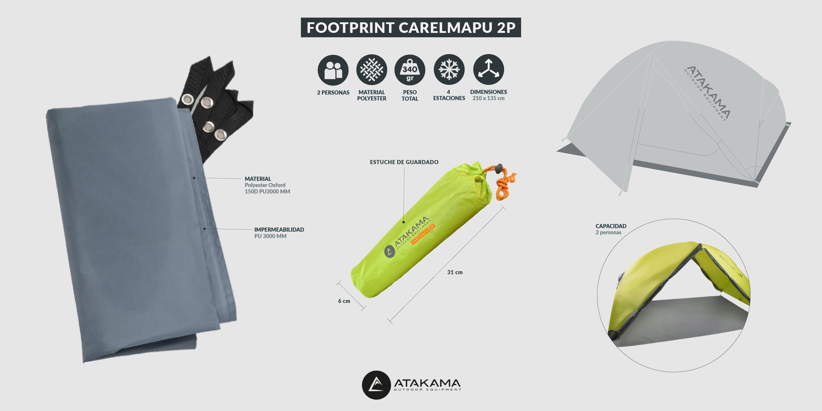 El Footprint protegerá el suelo de tu carpa del frío y la humedad, preservando en perfecto estado el piso principal de tu tienda. Con este accesorio, evitarás daños provocados por objetos afilados y el desgaste ocasionado por el terreno, asegurando una mayor durabilidad de tu carpa.