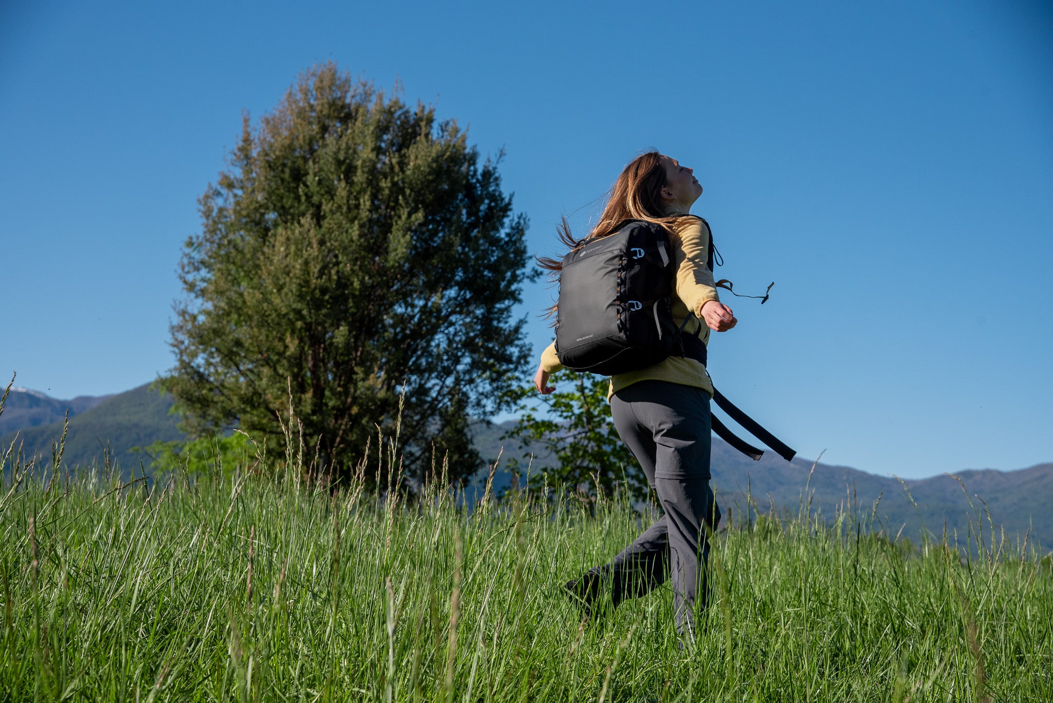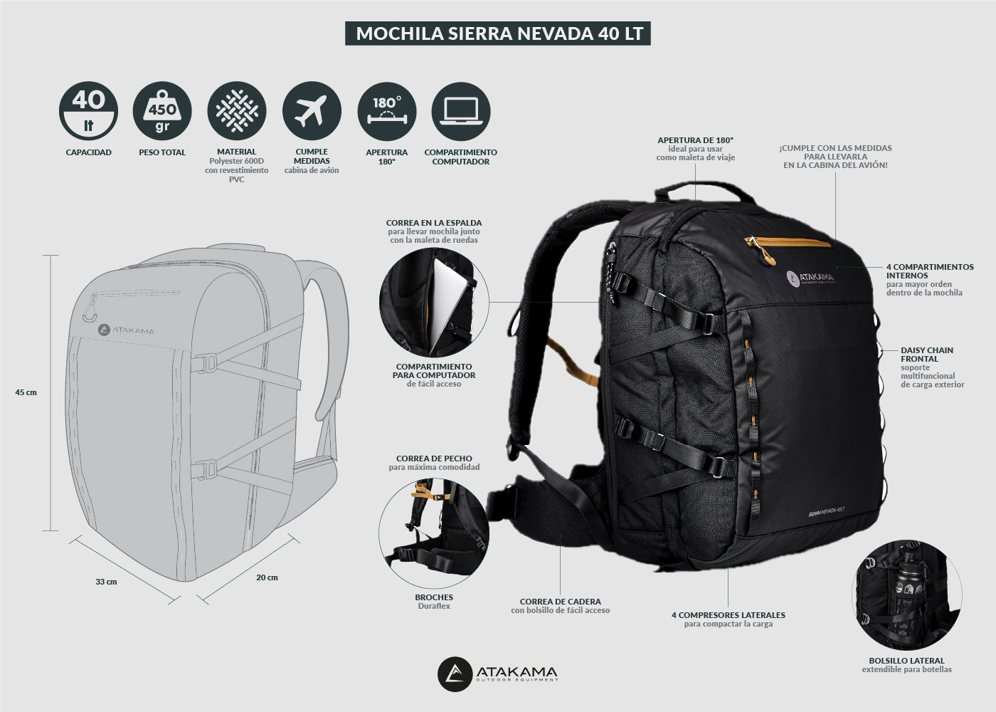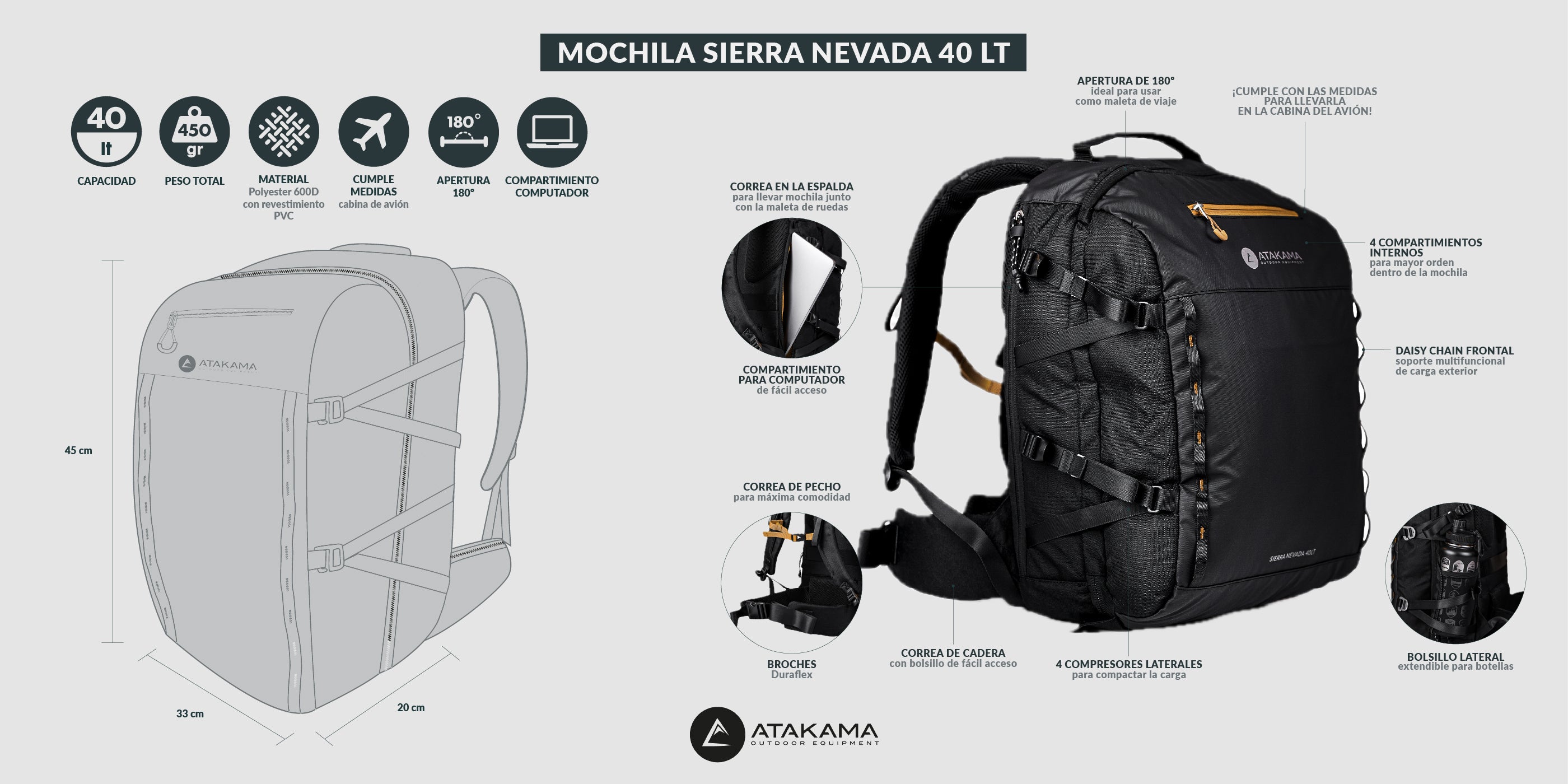 Mochila de viaje con apertura 180°, compartimiento para computador, múltiples bolsillos y correas ergonómicas; cumple medidas de cabina.