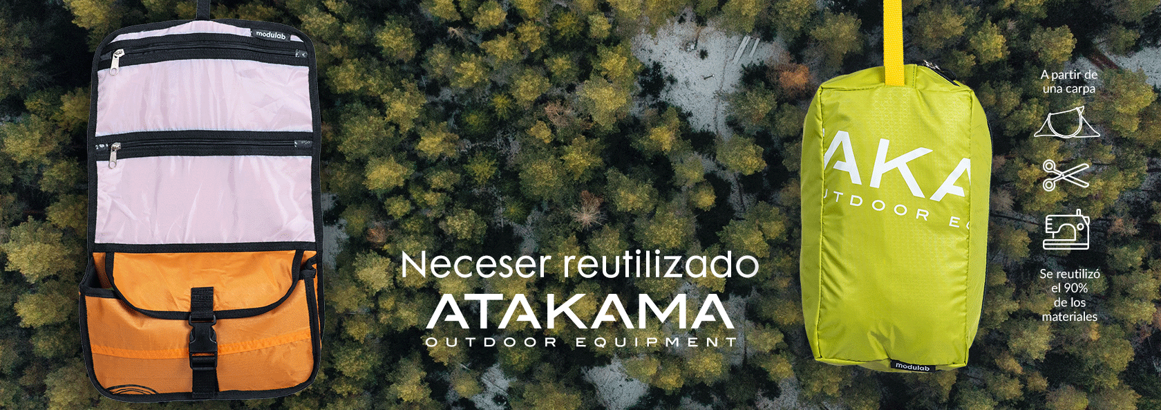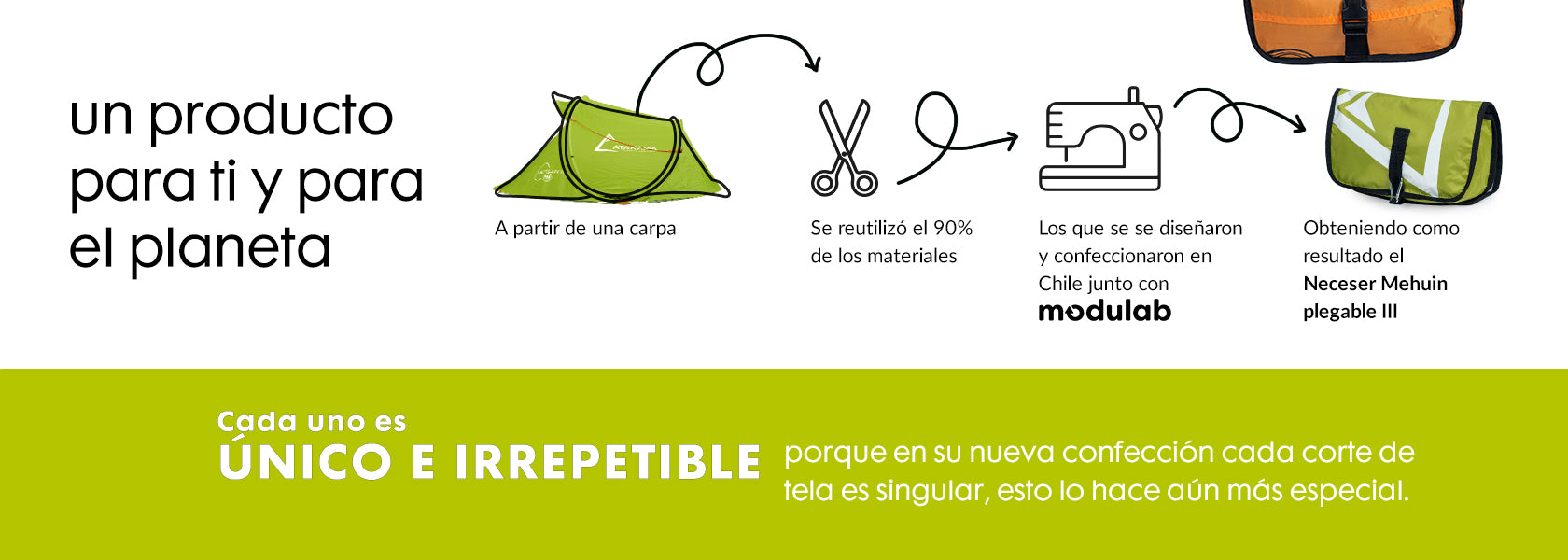 ¡Organiza tus cosas con sentido! Diseñado para que lo cuelgues donde quieras. El neceser Mehuin está creado a partir de la reutilización de carpas, por lo que cada tela tiene un estampado único. Descubre más sobre este neceser plegable abajo.