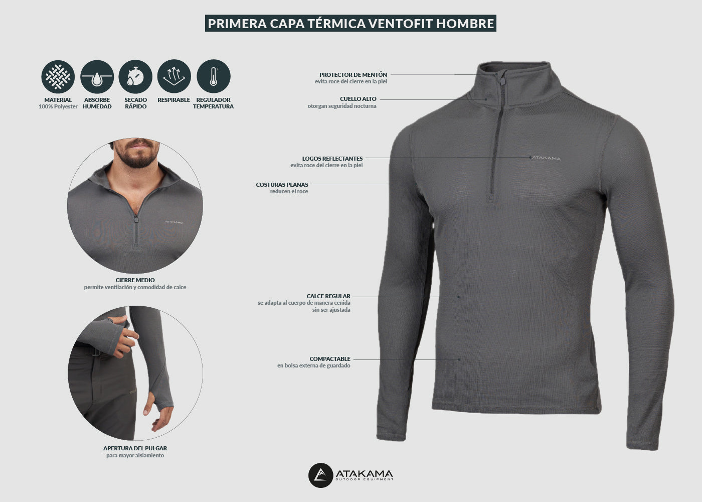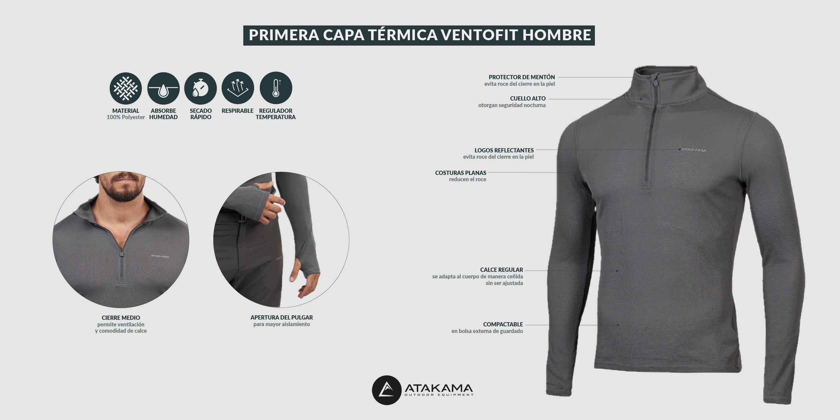 Equípate y mantente seco y flexible con nuestra primera capa Ventofit. Se guarda en su bolsa de malla.