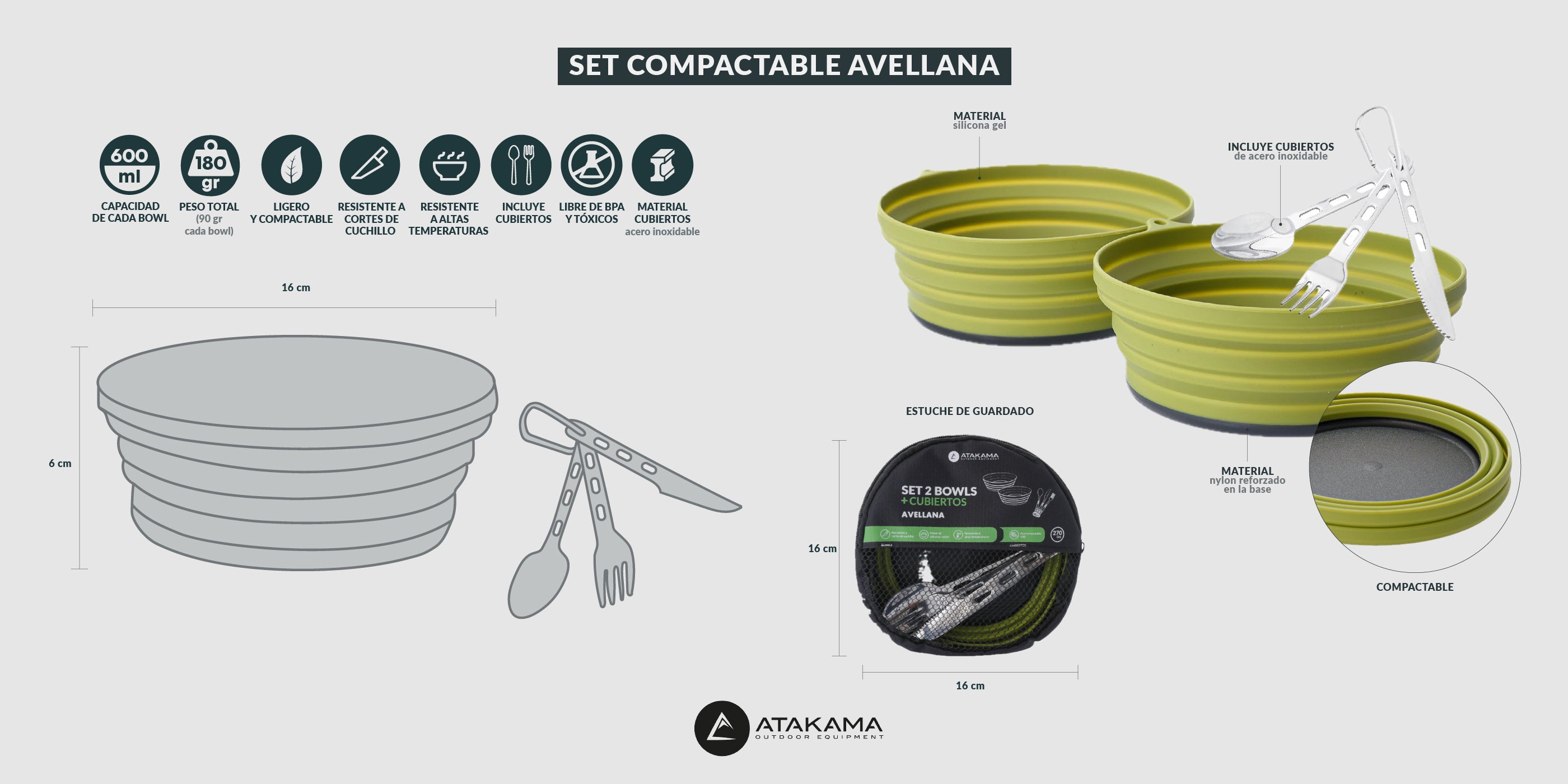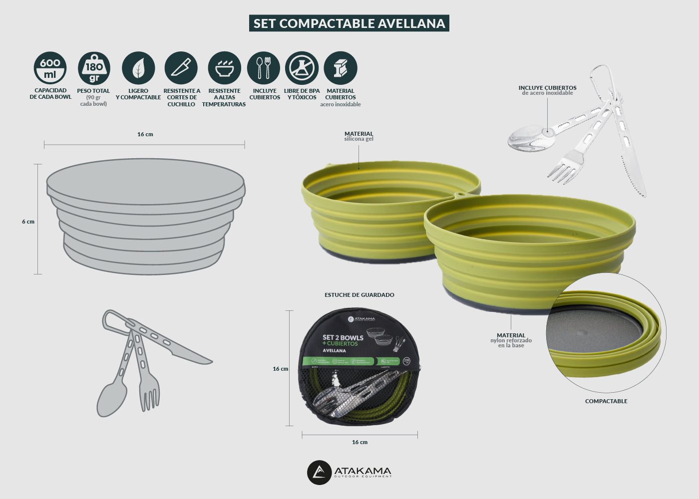 Este set de 2 bowls compactables con cubiertos, es perfecto para tus aventuras, combinando ligereza, resistencia y practicidad. Con un diseño plegable y materiales duraderos, es ideal para cualquier experiencia al aire libre.