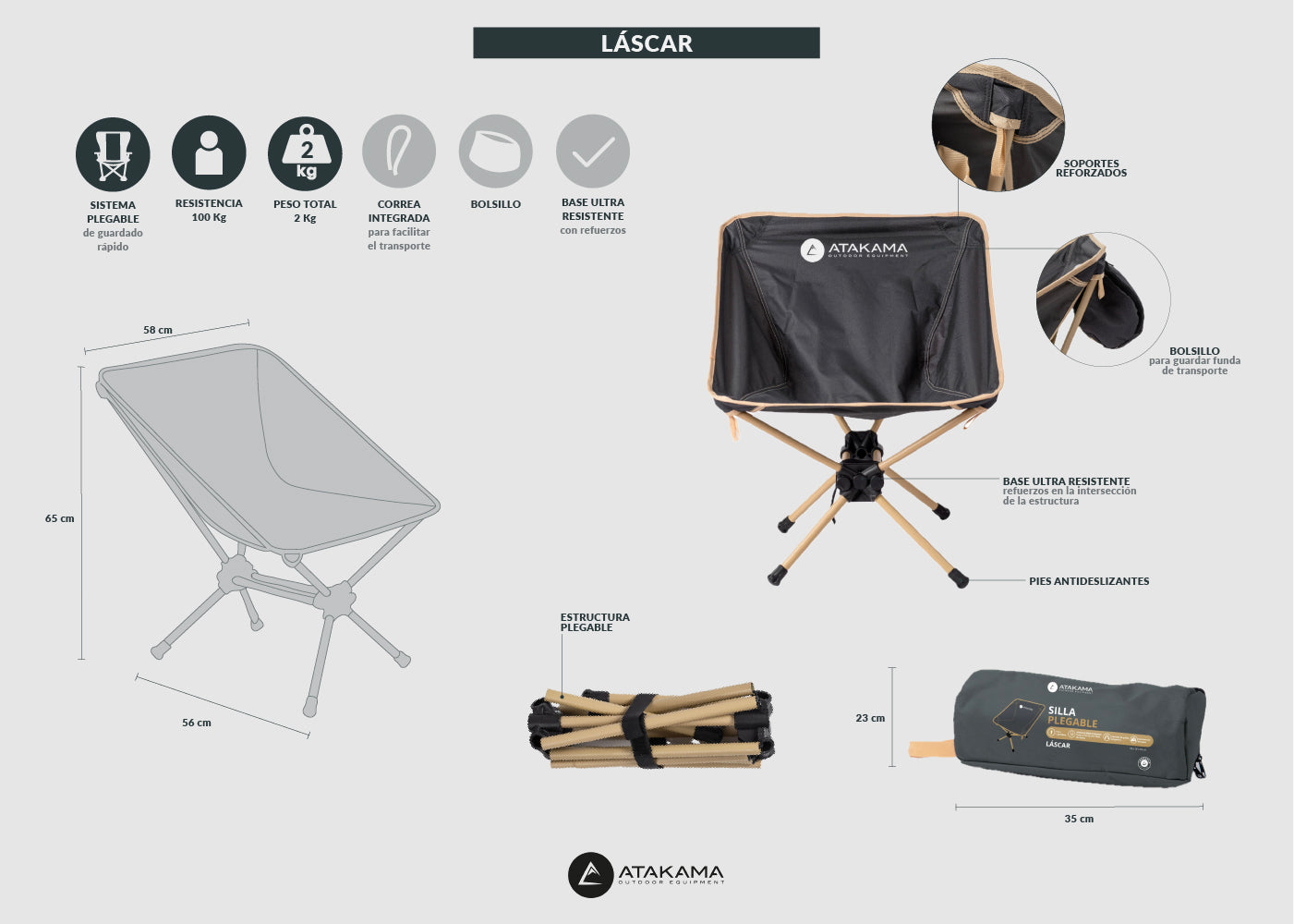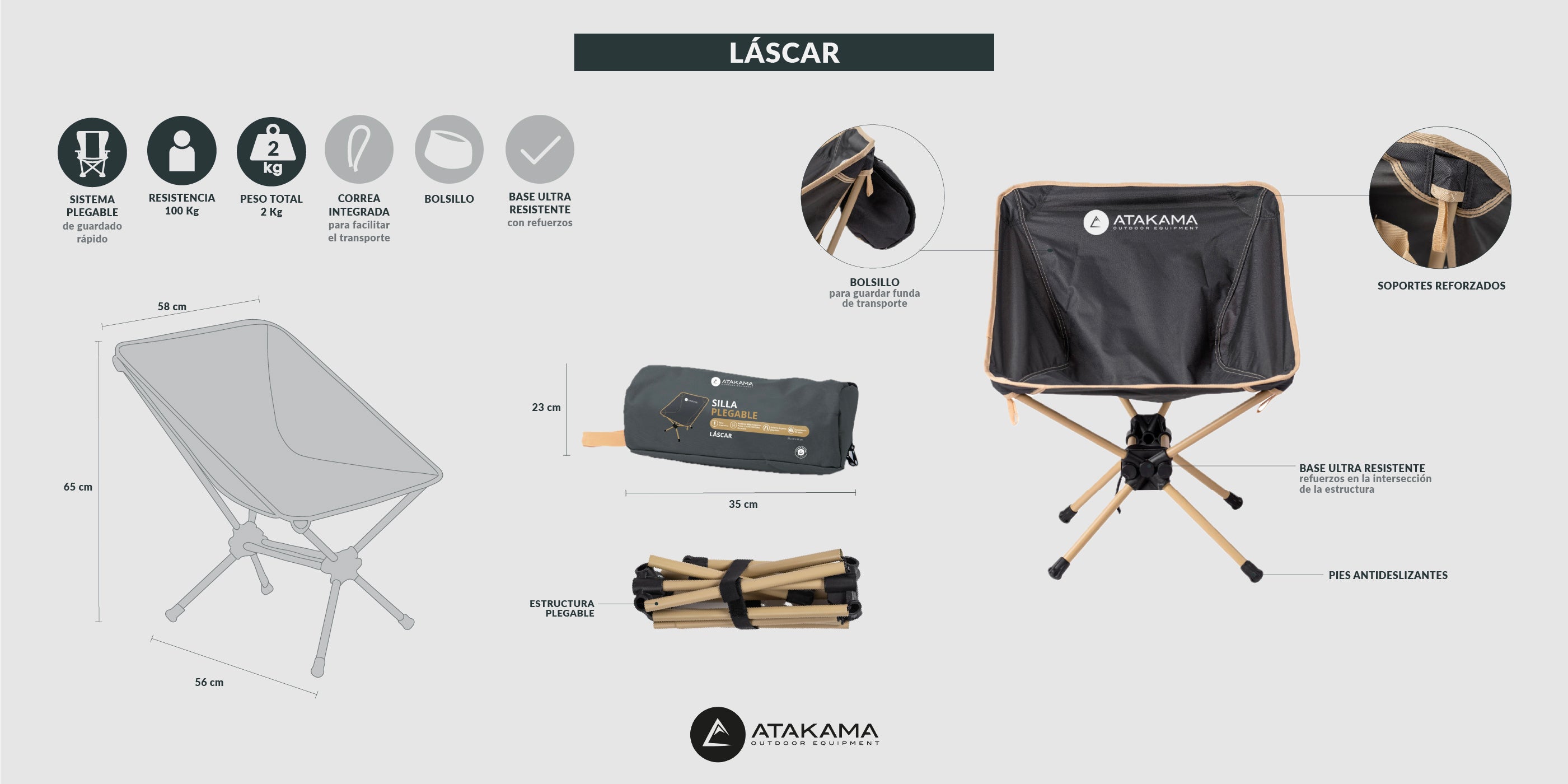Cómoda, compacta, transportable y fácil de armar. La silla plegable Láscar es un infalible en el equipamiento de camping de cualquier persona.