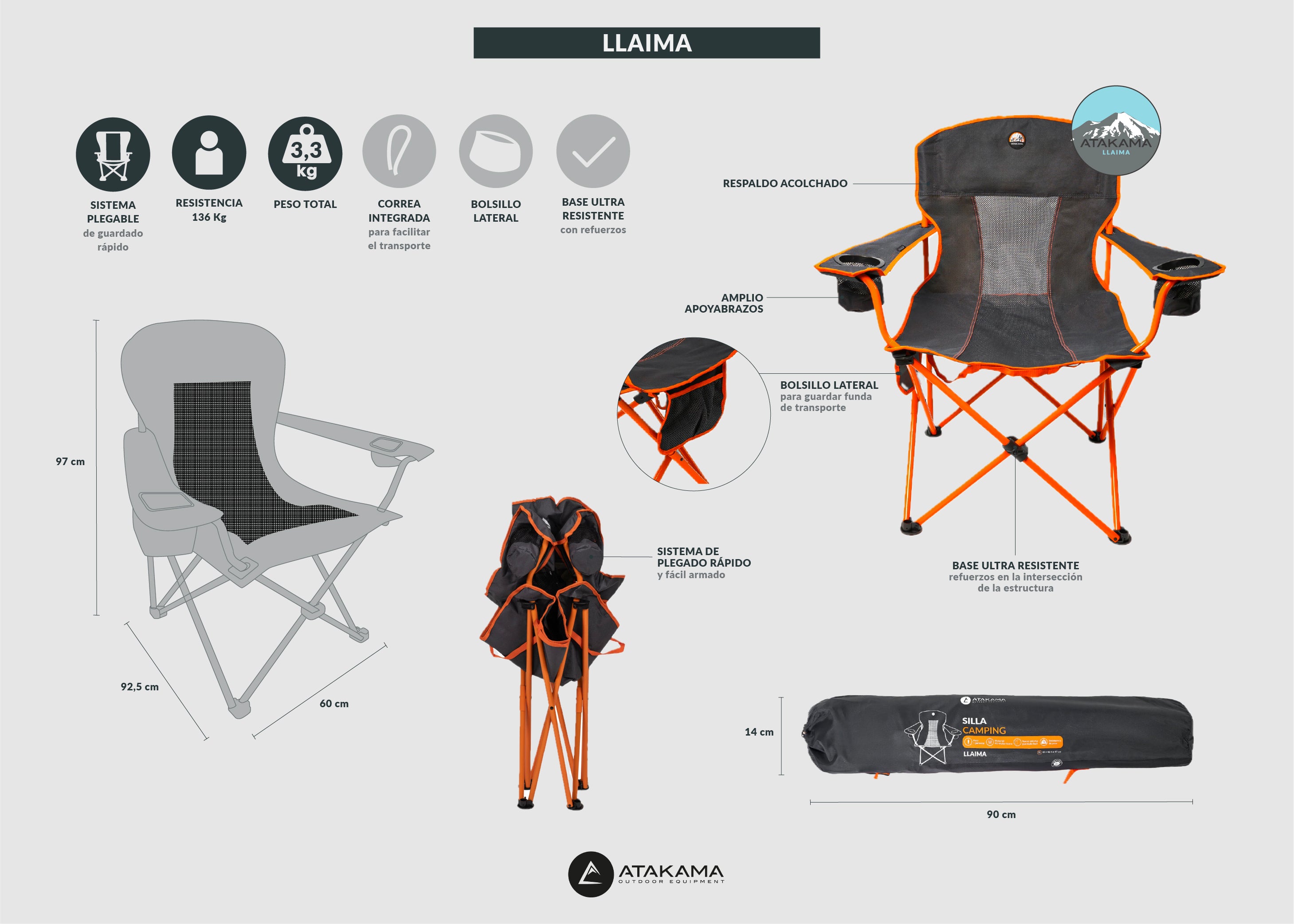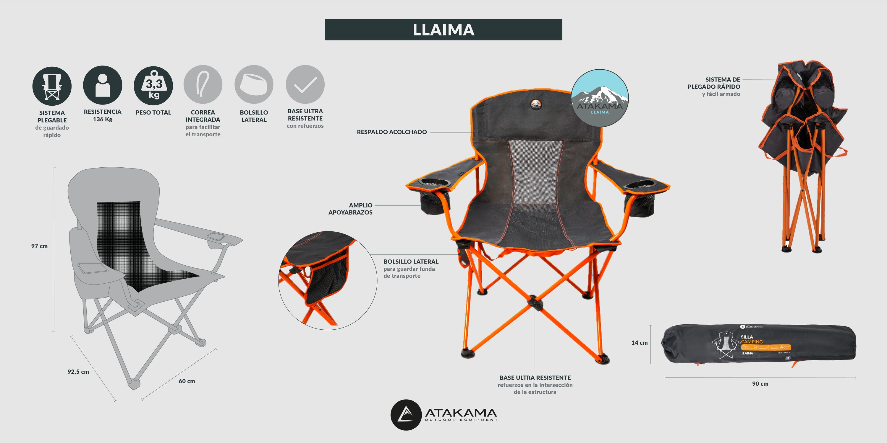Amplia, cómoda, compacta, transportable y fácil de armar. La silla Llaima es un infaltable a la hora de salir de camping.