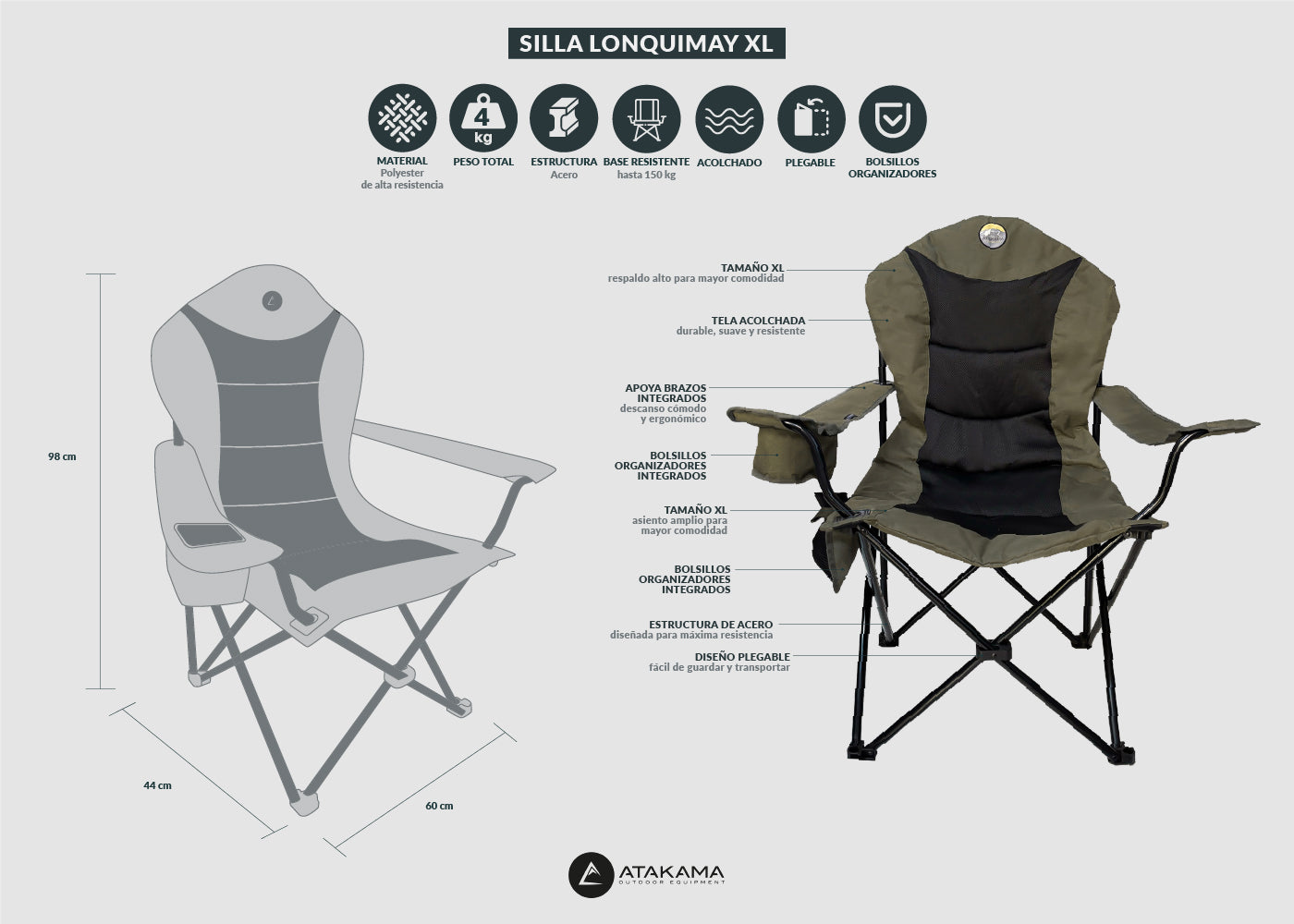 La Silla Lonquimay XL está pensada para esos momentos donde la aventura se detiene y comienza el descanso. Su diseño amplio y cómodo te invita a sentarte sin prisa, a disfrutar del fuego, la vista o una buena conversación bajo el cielo abierto. Resistente y fácil de llevar, es la compañera ideal para tus pausas al aire libre.