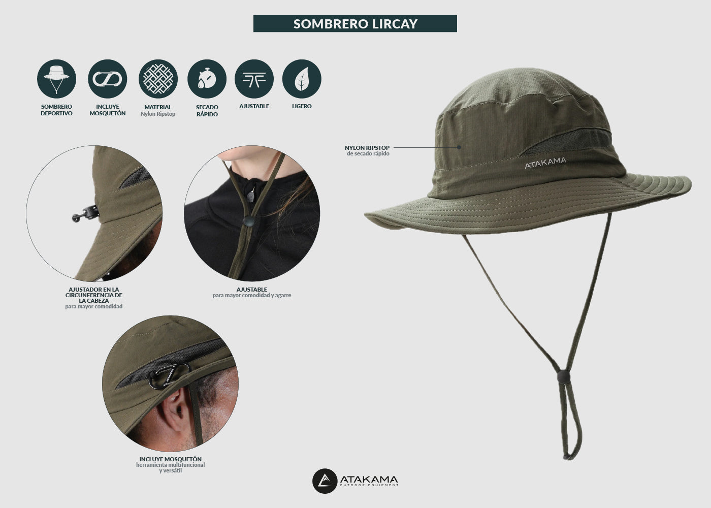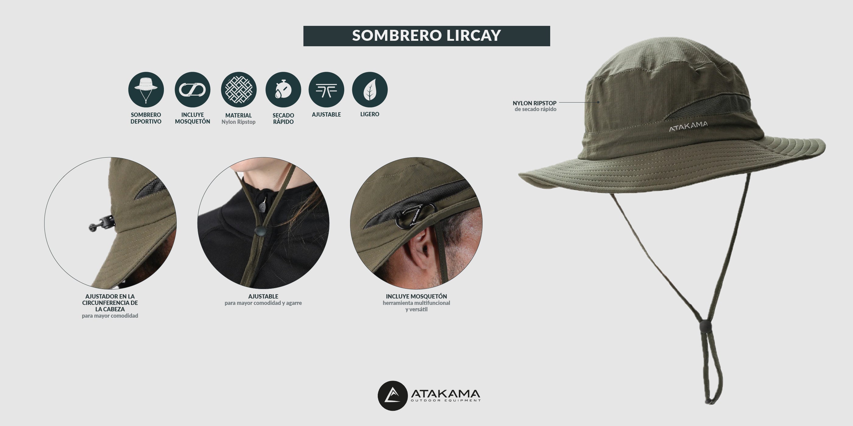 Sombrero Lircay, ligero y de secado rápido, con protección solar 360° y ajustadores para máxima adaptabilidad.