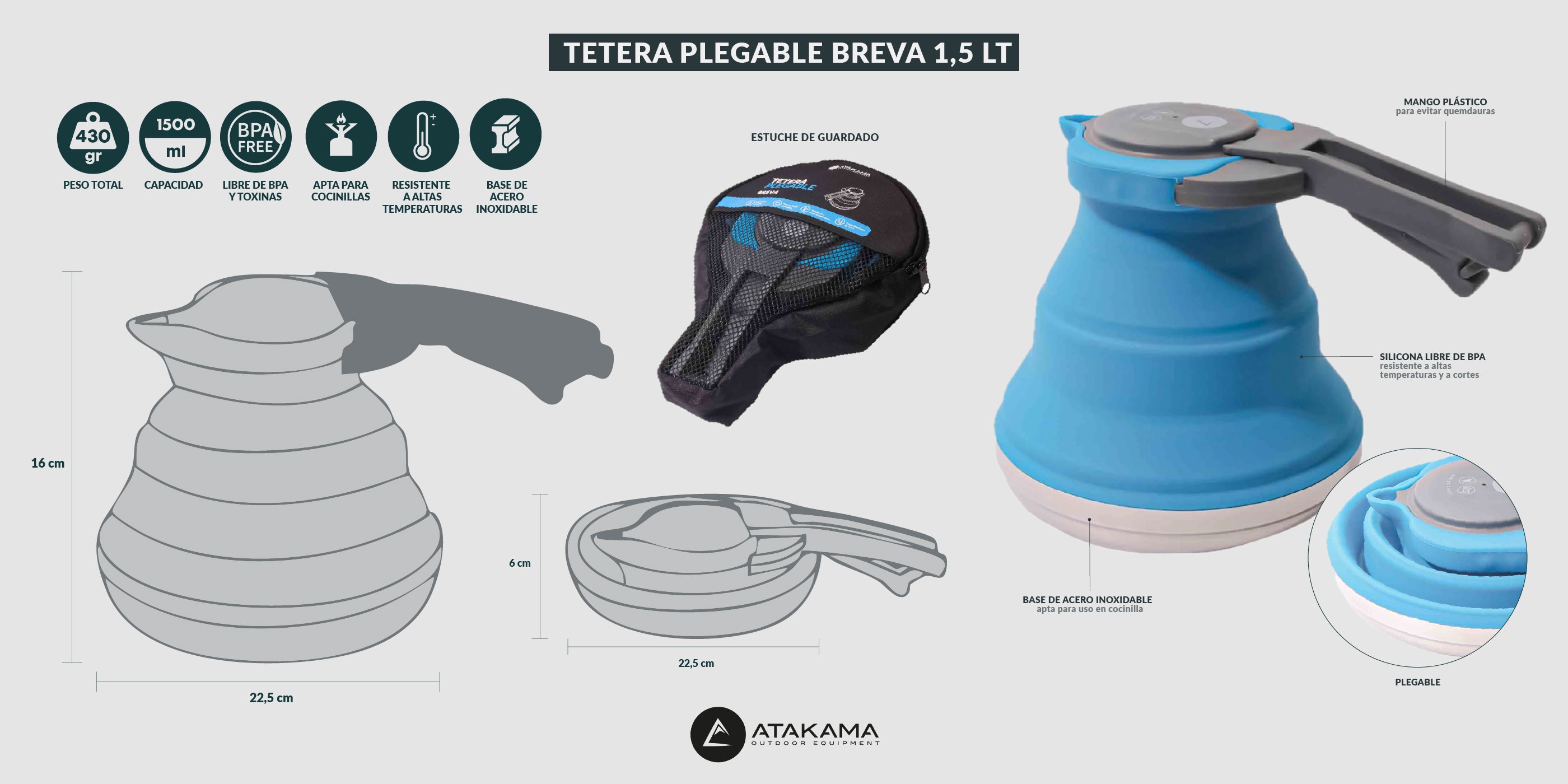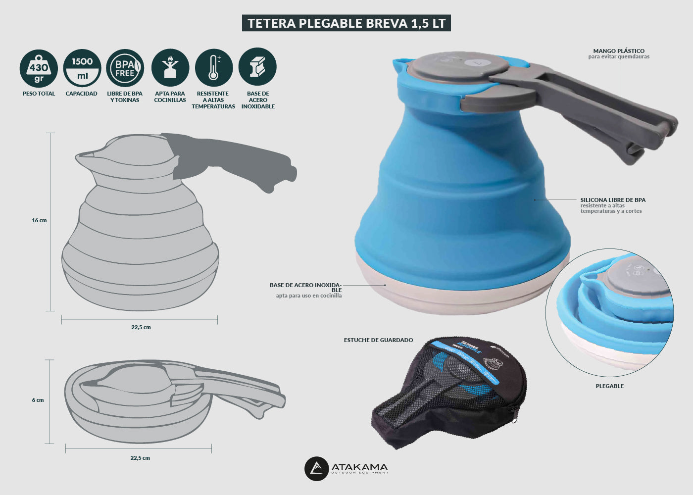 Útil, cómoda y compacta. Esta tetera plegable te ayudará a maximizar espacios cuando vayas de camping o trekking. Equipamiento clave de cocina en cada uno de tus paseos.