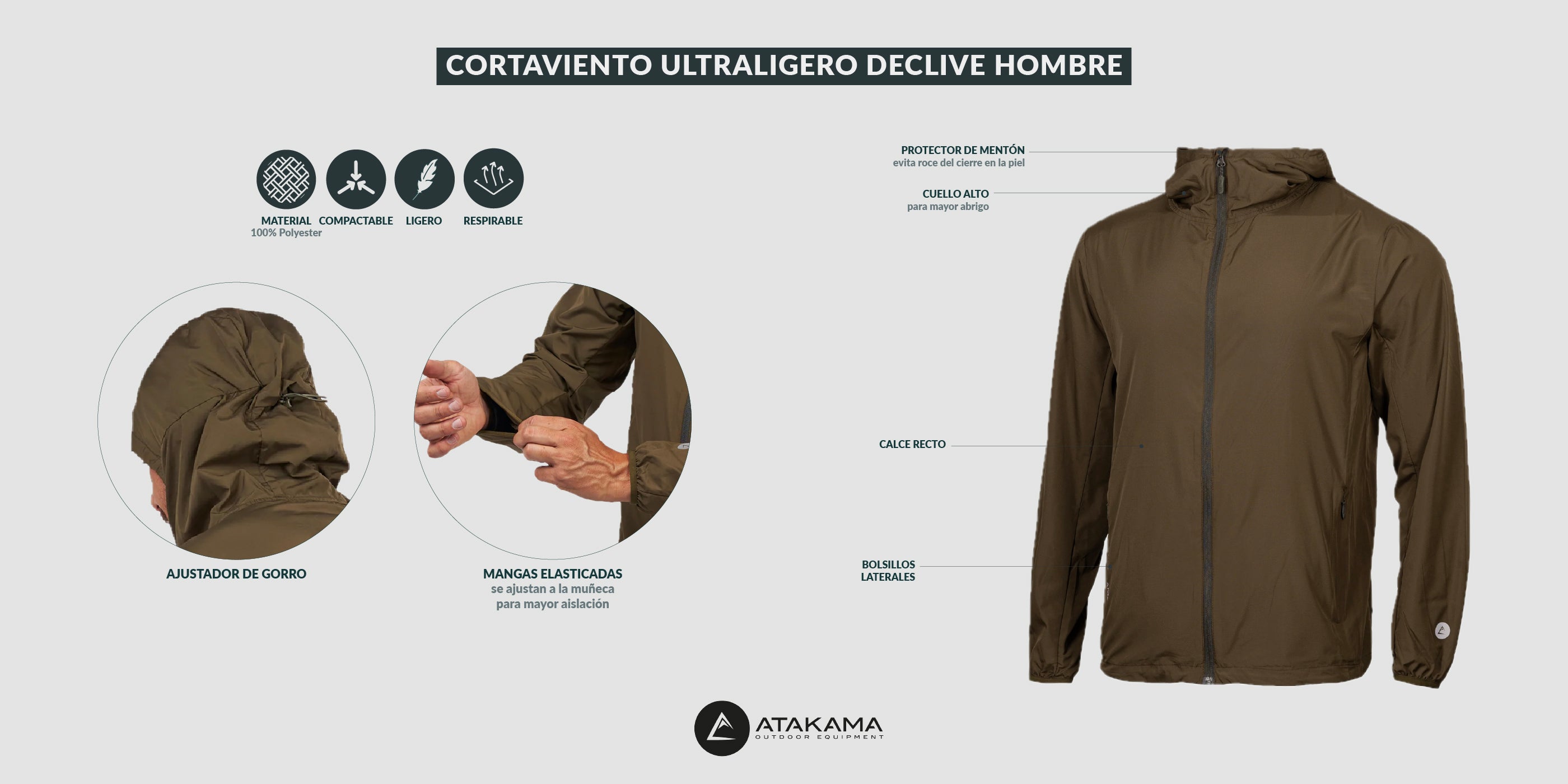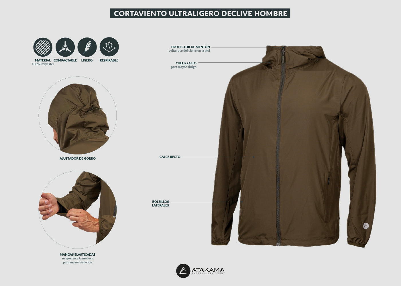 Equípate y protégete del viento con nuestro cortaviento Declive, liviano y resistente. Se guarda compacto en el bolsillo interno.