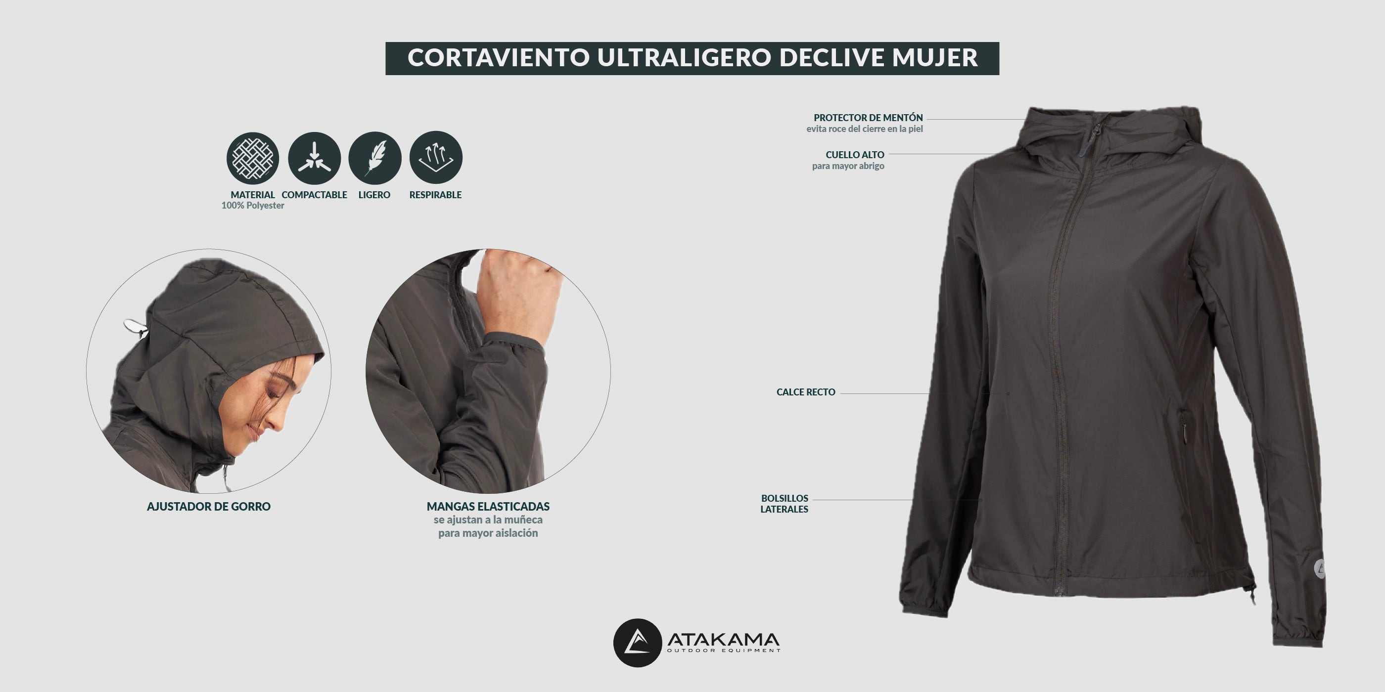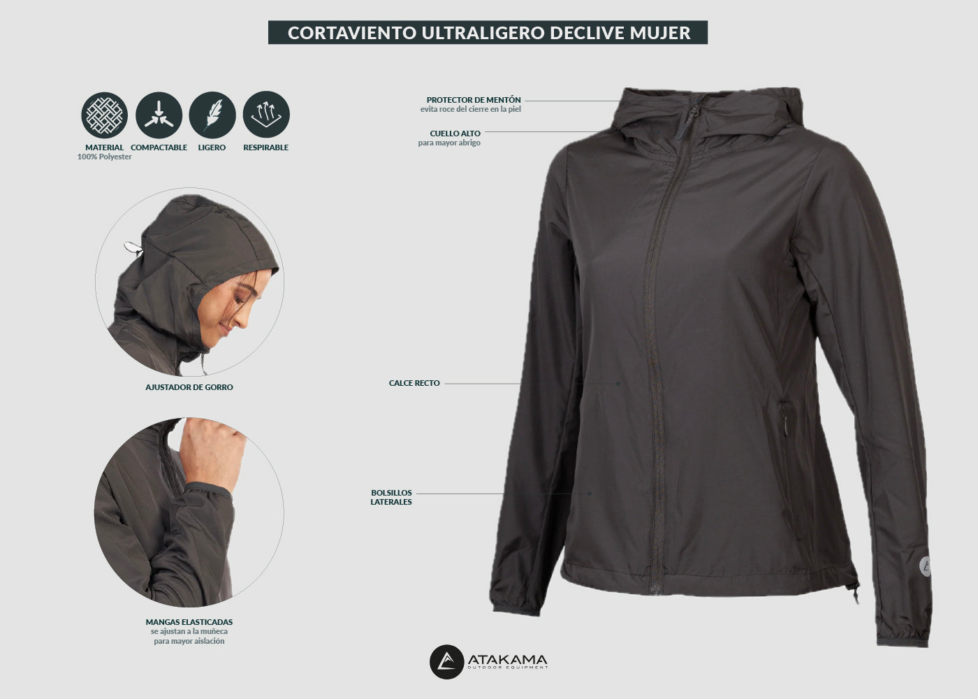 Equípate y protégete del viento con nuestro cortaviento Declive, liviano y resistente. Se guarda compacto en el bolsillo interno.