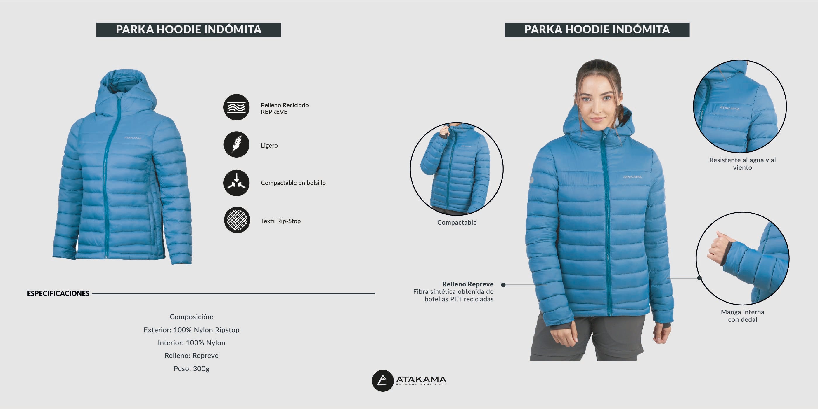 Equípate y abrígate con nuestra parka térmica Indómita, con capucha ajustable y cuello alto. Se guarda en el bolsillo interno.
